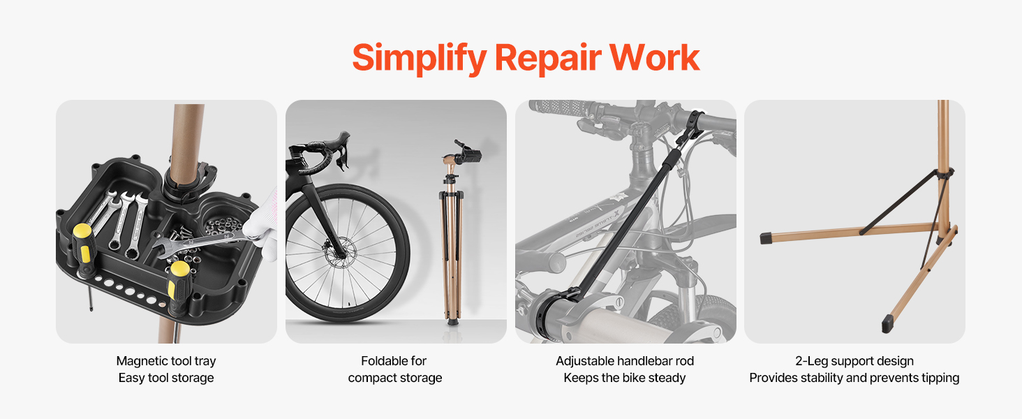 Stojan na údržbu bicyklov je vybavený rôznym príslušenstvom, má nastaviteľnú tyč na riadidlá, ktorá udržiava predné koleso v stabilnej polohe, zásobník s viacerými priehradkami na rýchlu organizáciu náradia a konštrukciu s dvoma nohami na stabilnú oporu bez prevrátenia.