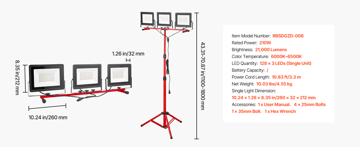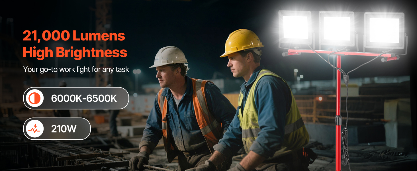 Naše LED pracovné svetlo so stojanom podporuje prepínanie z teplej bielej farby 6000 K na studenú bielu farbu 6500 K s nastaviteľnou jasnosťou až do 21 000 lúmenov. To pomáha uspokojiť rôzne potreby, ako je nočná práca, osvetlenie dvora alebo vytvorenie príjemného prostredia.