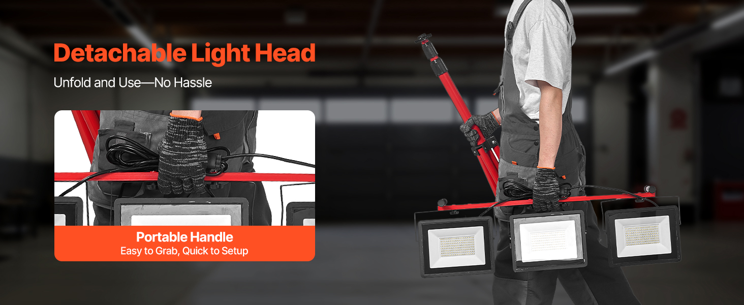 Naše LED pracovné svetlo má odnímateľný dizajn hlavy svietidla, čo umožňuje nezávislé použitie každej z nich. V kombinácii s ergonomickou prenosnou rukoväťou tento dizajn umožňuje rýchle a efektívne nasadenie, ideálne pre prácu v stiesnených priestoroch alebo núdzové opravy.