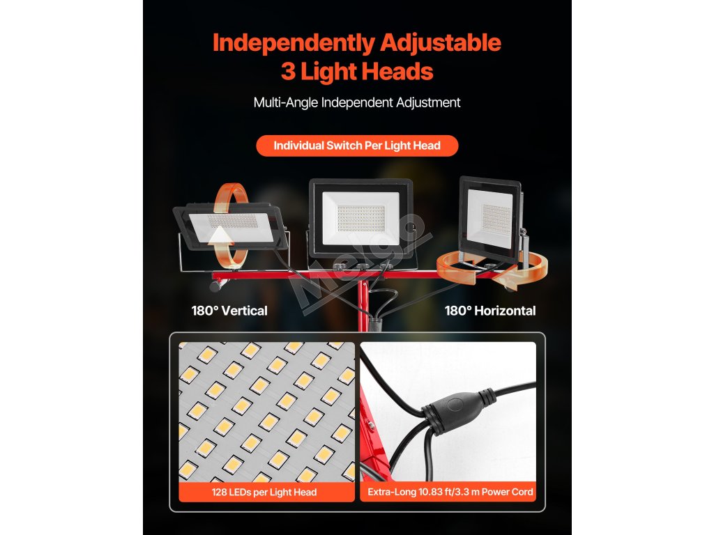 Led pracovné svetlo na statíve, 3 hlavy, 21000 lm, IP65, 3,3 m kábel
