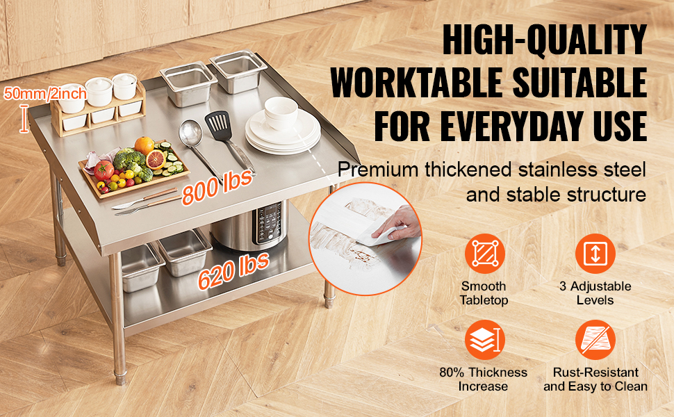 Náš pracovný stôl, ktorý je vyrobený z nehrdzavejúcej ocele SUS201 na dosku stola, police a nohy, sa môže pochváliť vynikajúcou odolnosťou proti korózii a atraktívnejšou povrchovou úpravou v porovnaní s konkurenciou, ktorá používa nehrdzavejúcu oceľ 430 alebo pozinkované materiály. Vďaka certifikátu NSF tieto stoly spĺňajú prísne normy na ochranu verejného zdravia.