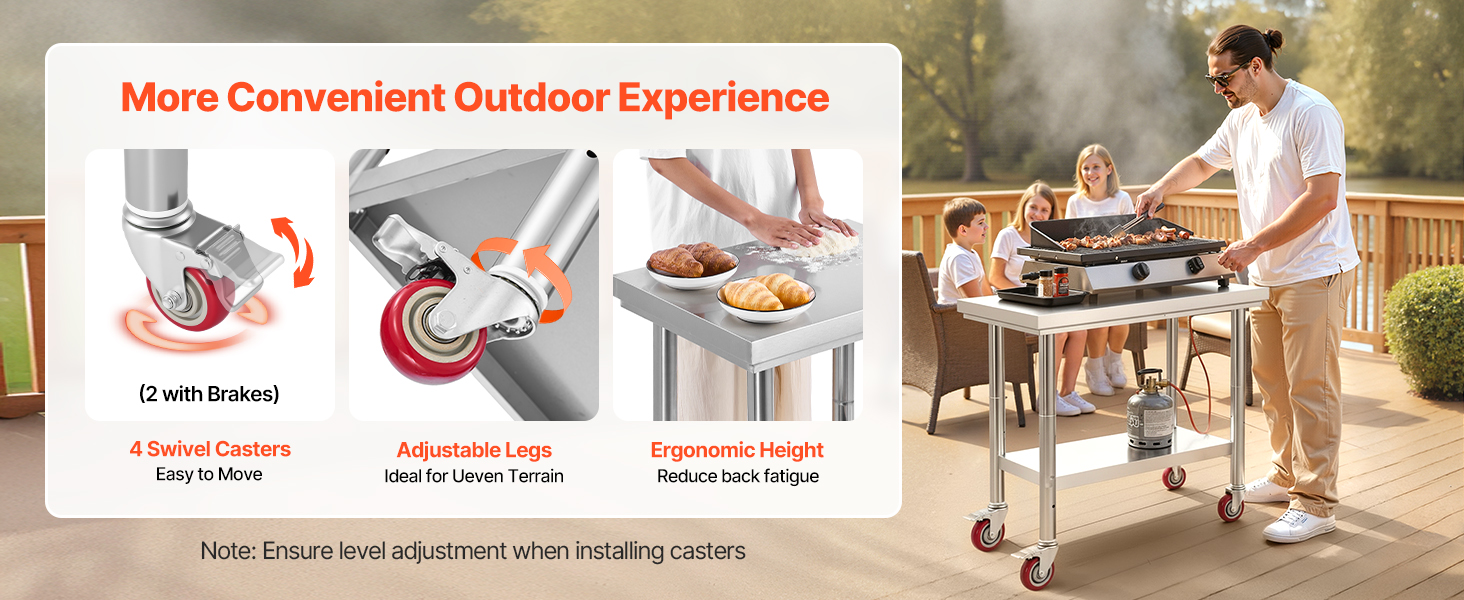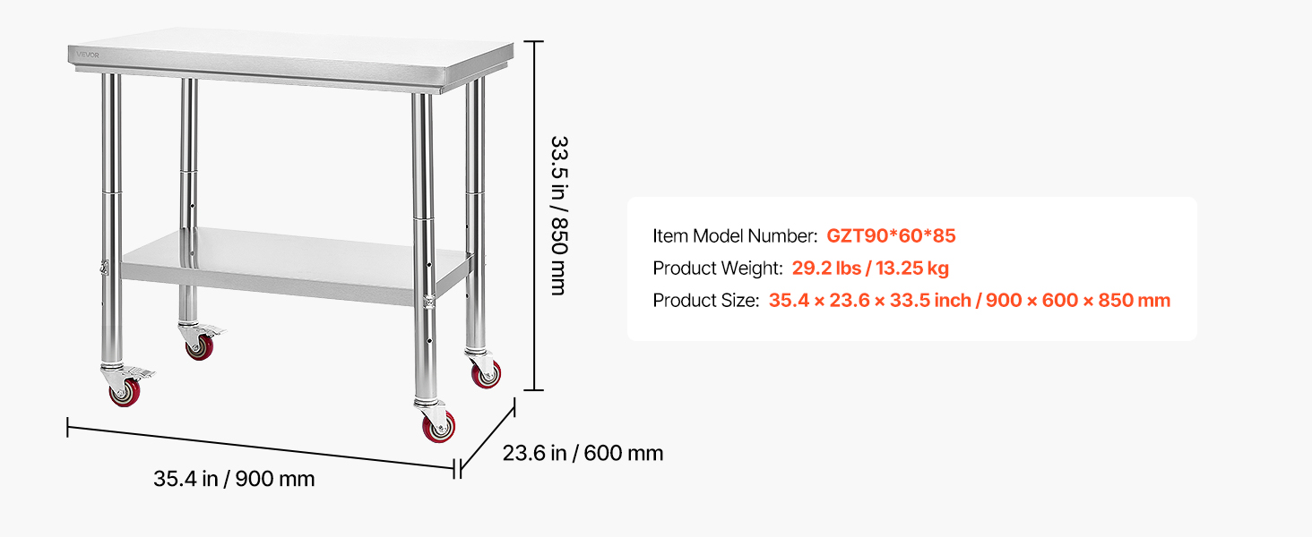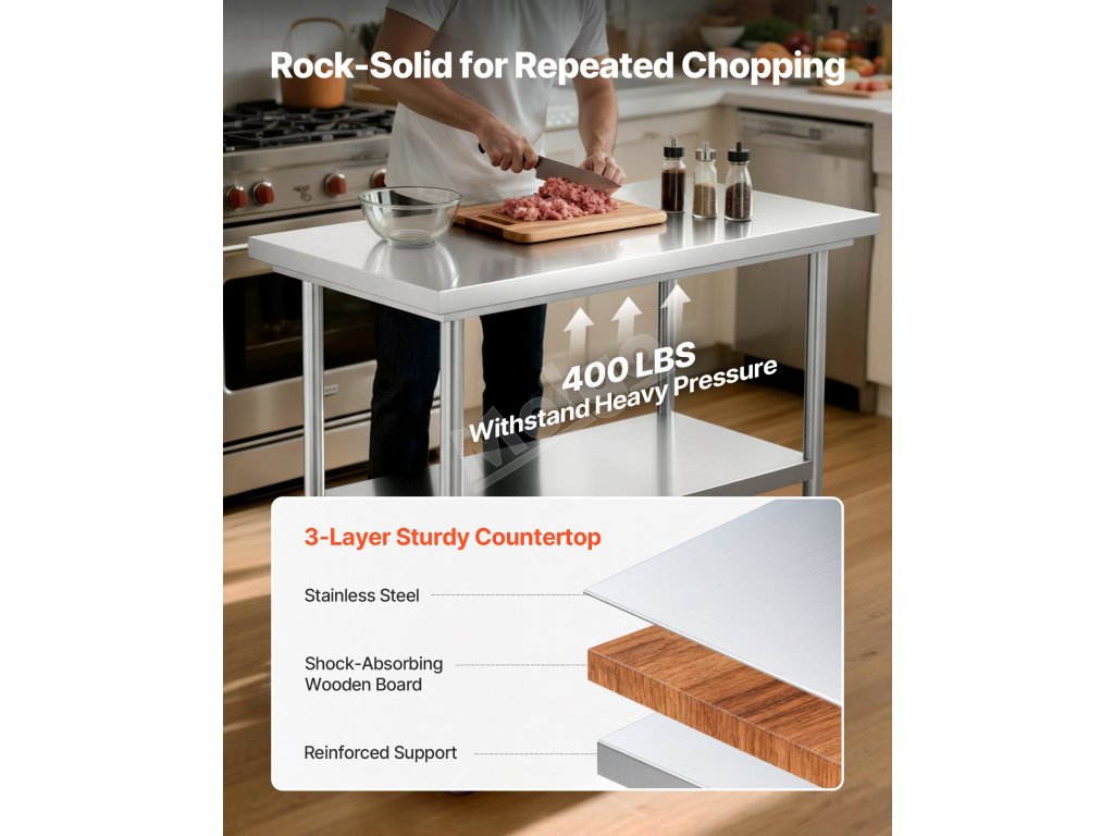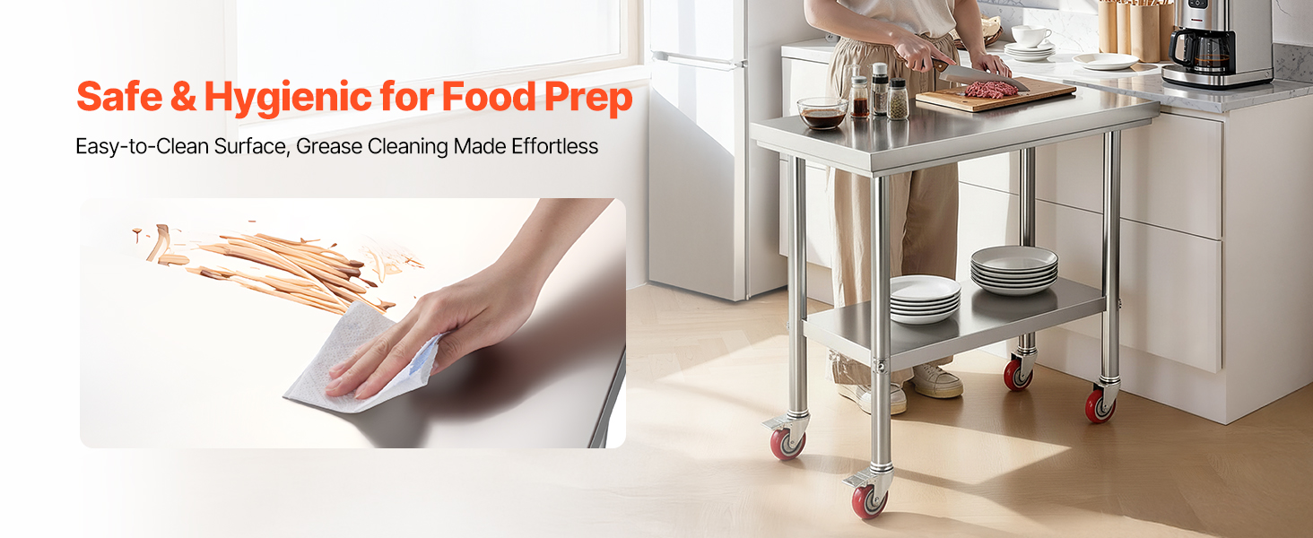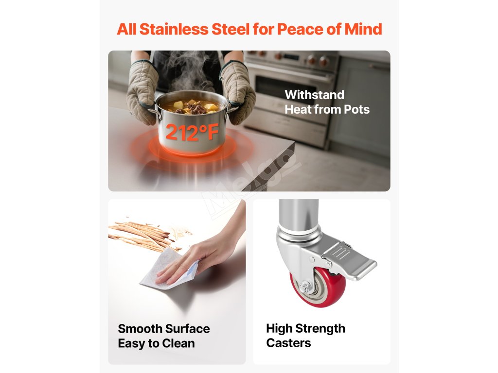 Náš pracovný stôl na prípravu potravín, ktorý je vyrobený z nehrdzavejúcej ocele SUS201 na dosku, police a nohy, sa môže pochváliť vynikajúcou odolnosťou proti korózii a atraktívnejšou povrchovou úpravou v porovnaní s konkurenciou, ktorá používa nehrdzavejúcu oceľ 430 alebo pozinkované materiály.