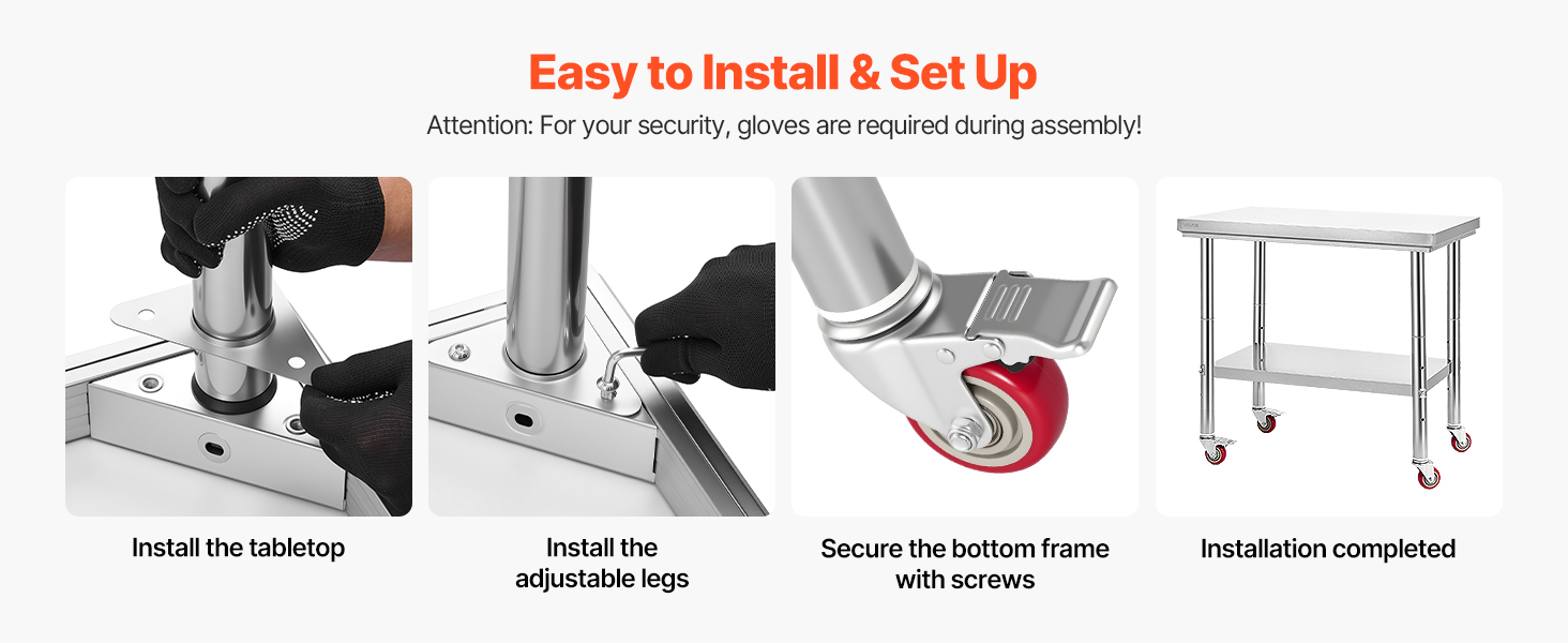 Náš pracovný stôl z nehrdzavejúcej ocele s kolieskami má vysokokvalitnú nehrdzavejúcu oceľ pre robustnú a odolnú konštrukciu. Je odolný voči korózii a vode a jeho čistenie je hračkou, stačí na to vlhká handrička.