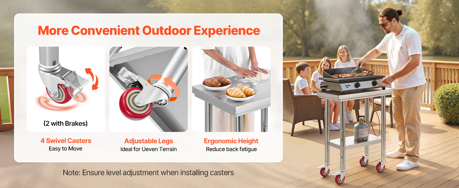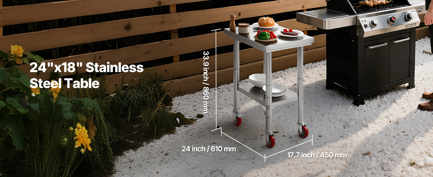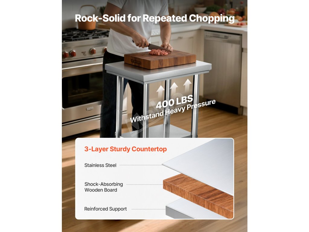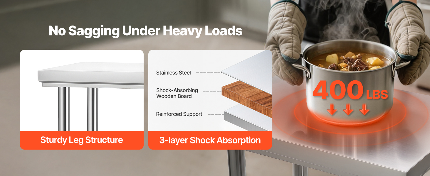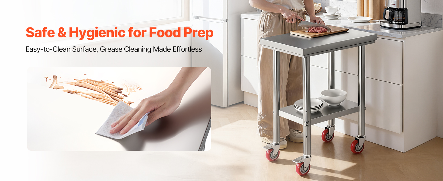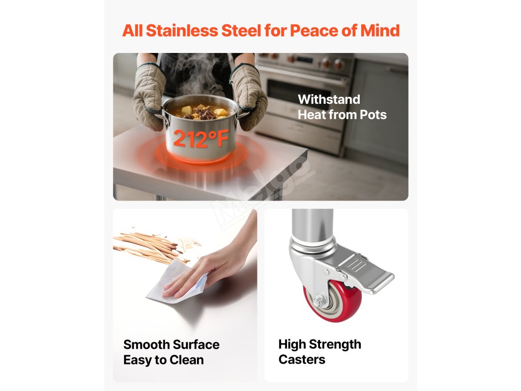 Náš pracovný stôl na prípravu potravín, ktorý je vyrobený z nehrdzavejúcej ocele SUS201 na dosku, police a nohy, sa môže pochváliť vynikajúcou odolnosťou proti korózii a atraktívnejšou povrchovou úpravou v porovnaní s konkurenciou, ktorá používa nehrdzavejúcu oceľ 430 alebo pozinkované materiály.