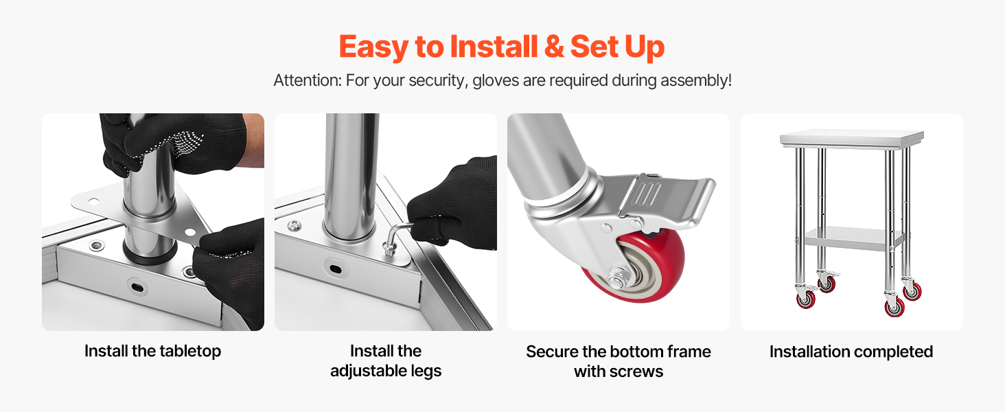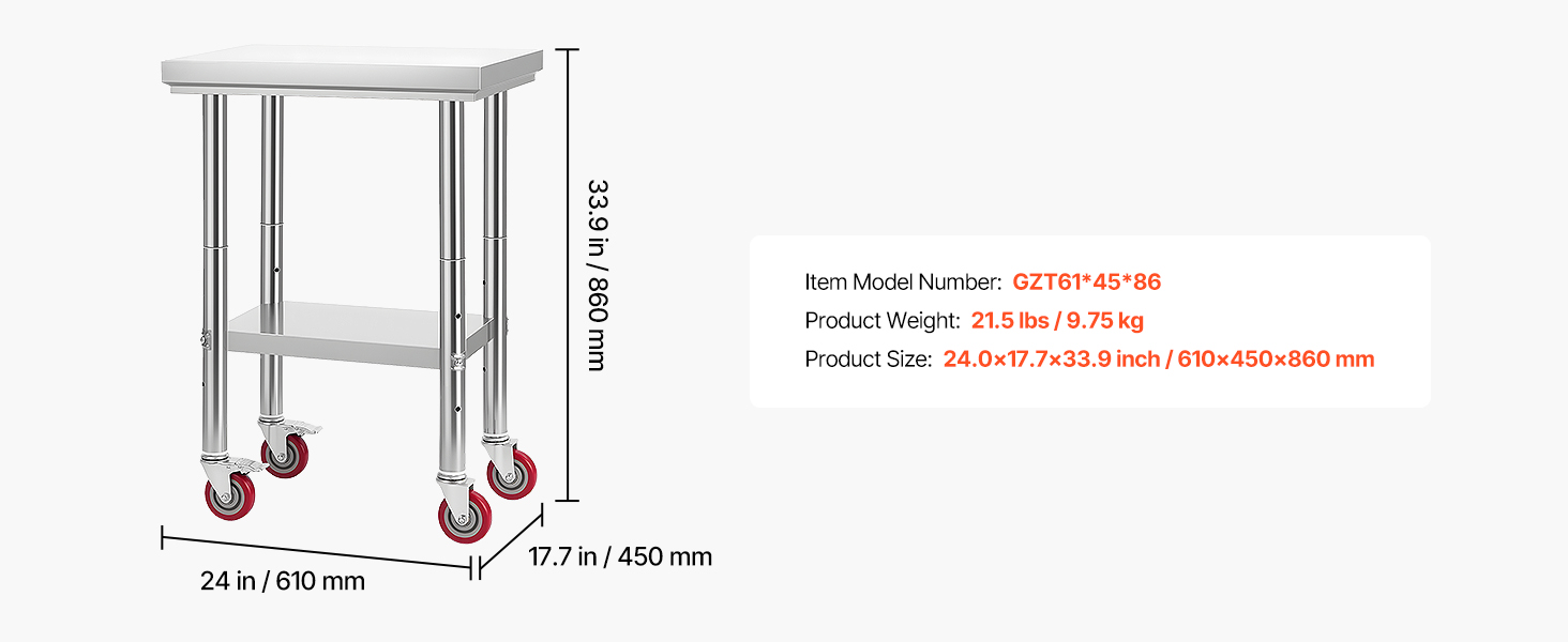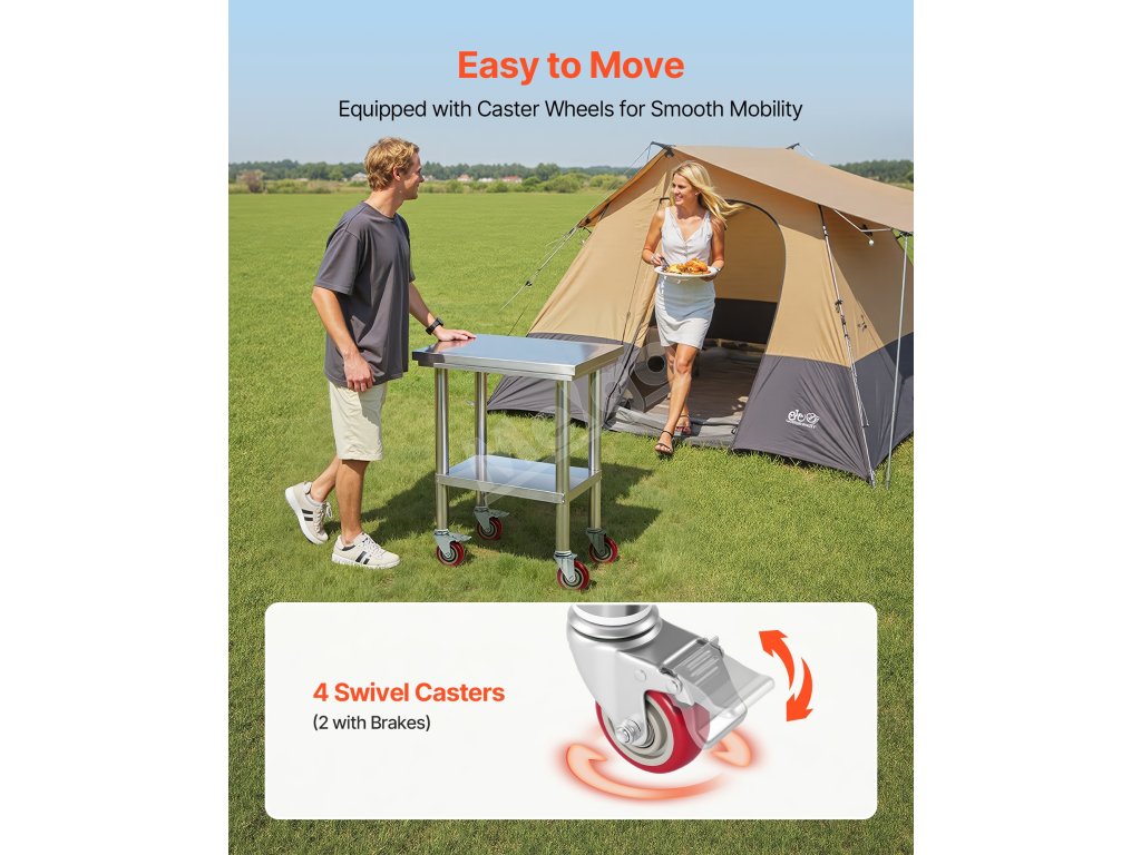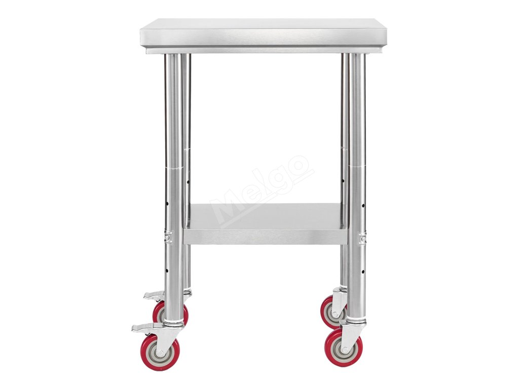 Náš pracovný stôl z nehrdzavejúcej ocele s kolieskami má vysokokvalitnú nehrdzavejúcu oceľ pre robustnú a odolnú konštrukciu. Je odolný voči korózii a vode a jeho čistenie je hračkou, stačí na to vlhká handrička.