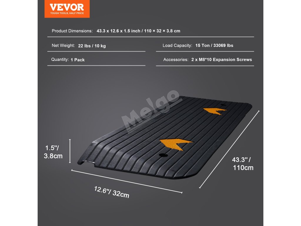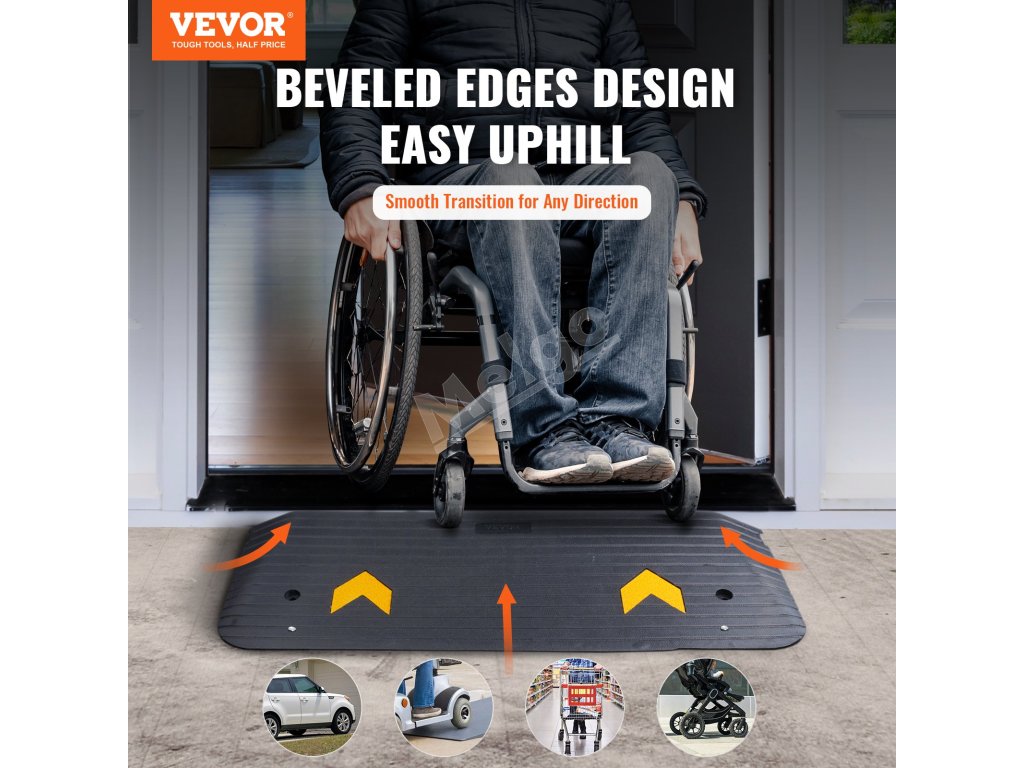 Odpoveď: VEVOR vám poskytuje rôzne veľkosti a výšky trojuholníkových rámp. Tento výrobok možno použiť na prahy alebo schody s výškou 1,5 palca, čo umožňuje kolesám s maximálnou šírkou 43,3 palca plynulé stúpanie po svahu.