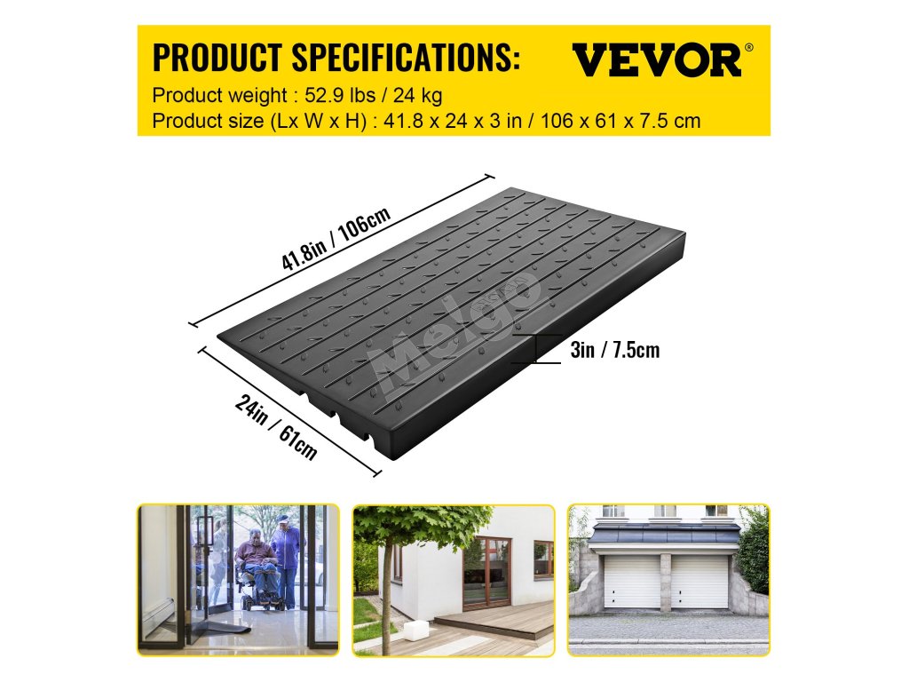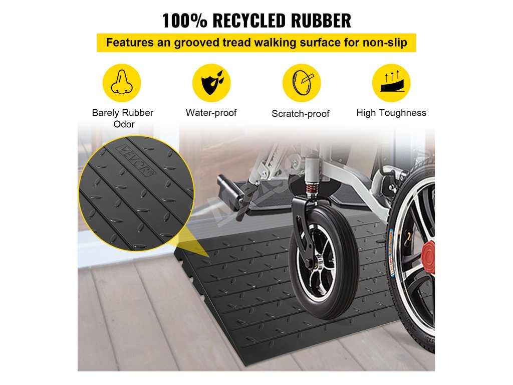 Gumová prahová rampa VEVOR je vyrobená zo silnej a odolnej recyklovanej gumy. Materiál jej dodáva pevný pocit pri zachovaní flexibility. Rampa zvládne vďaka recyklovanému plastu nosnosť až 2200 libier. Vďaka tomu je ideálna pre invalidné vozíky, skútre a ťažké aplikácie. Gumový materiál si poradí aj s náročnými vonkajšími podmienkami. Protišmykový povrch poskytuje vynikajúcu priľnavosť aj za vlhkého počasia. Táto rampa je praktickým a účinným riešením na zlepšenie mobility a prístupu.