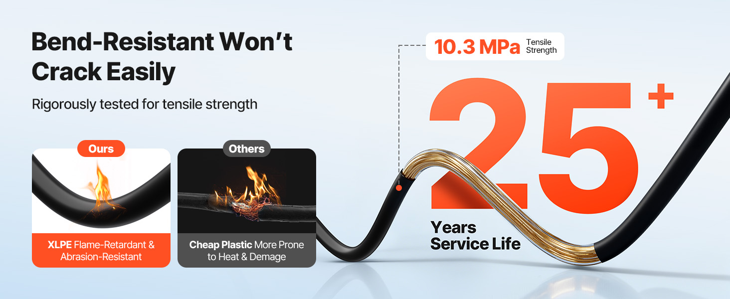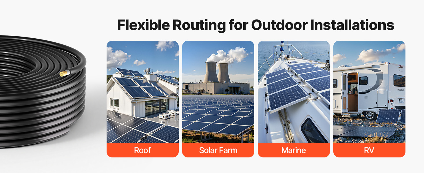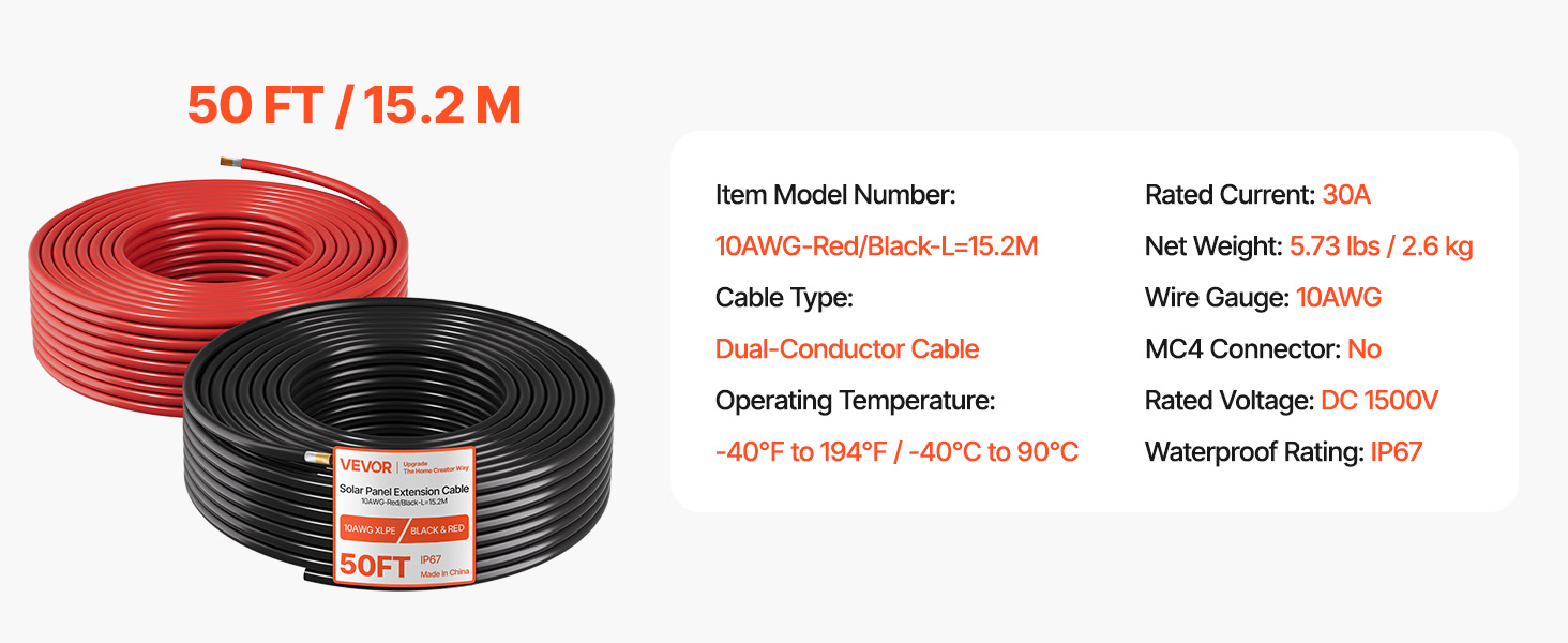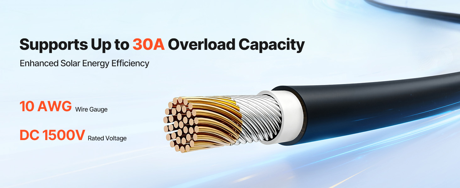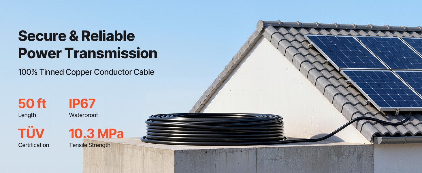 Tento predlžovací kábel je vyrobený zo 100 % pocínovanej medi a drôtu 10 AWG a podporuje vysoký prúd pre bezpečný a stabilný prenos energie. Dĺžka 50 ft umožňuje flexibilné usporiadanie. S krytím IP67 proti prachu a vode, izoláciou XLPE a testovaním podľa normy TÜV je vyrobený tak, aby vydržal vonkajšie použitie.
