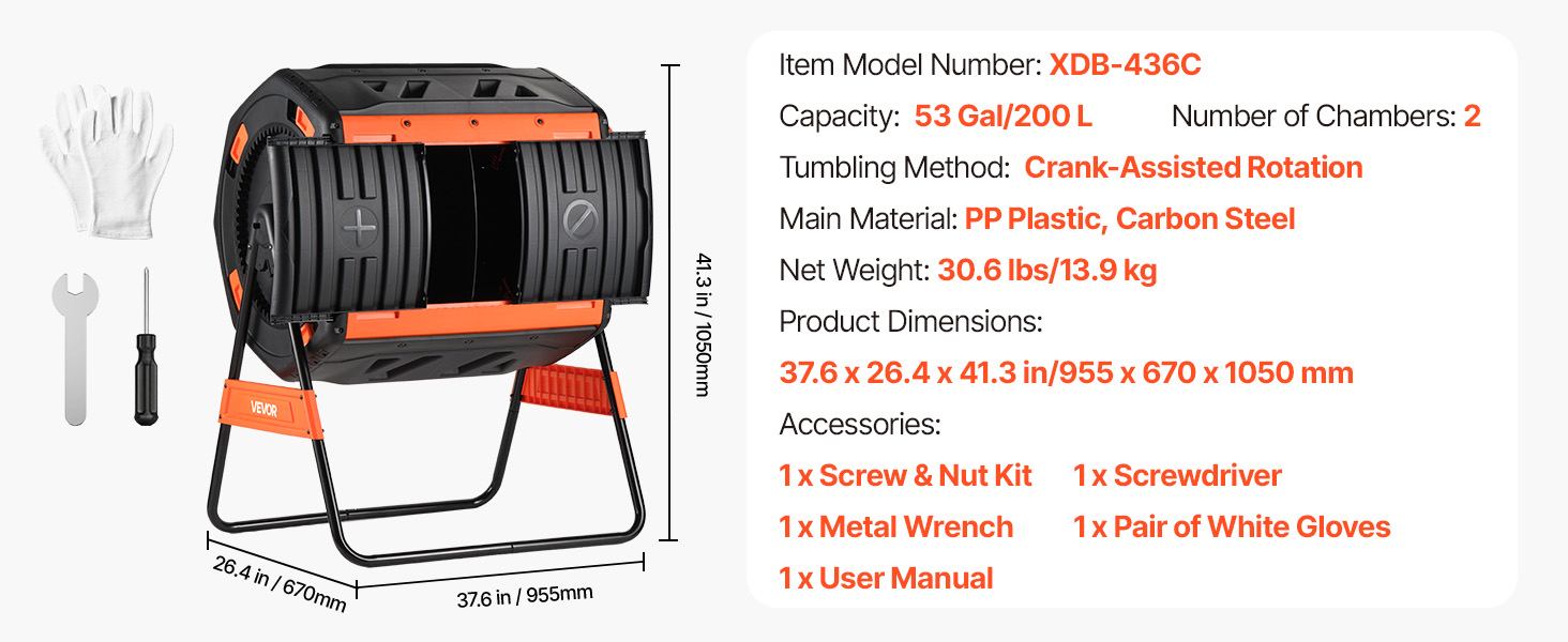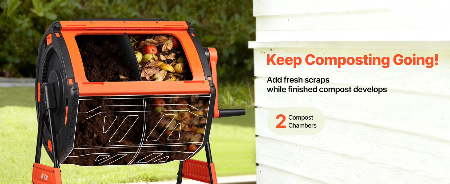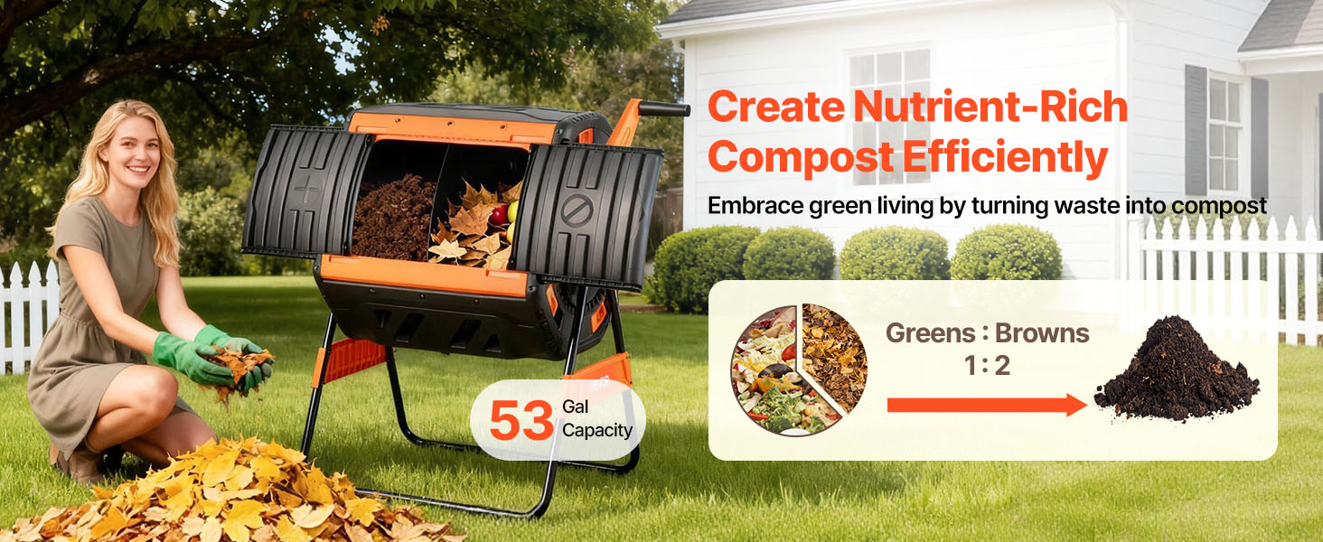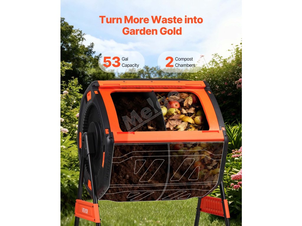 Premeňte kuchynský odpad a záhradný odpad na kompost bohatý na živiny s týmto 53-galónovým dvojkomorovým kompostérom – čistým, efektívnym a nenáročným pre každého domáceho záhradníka.