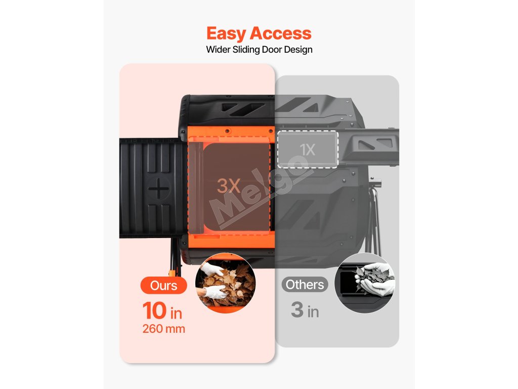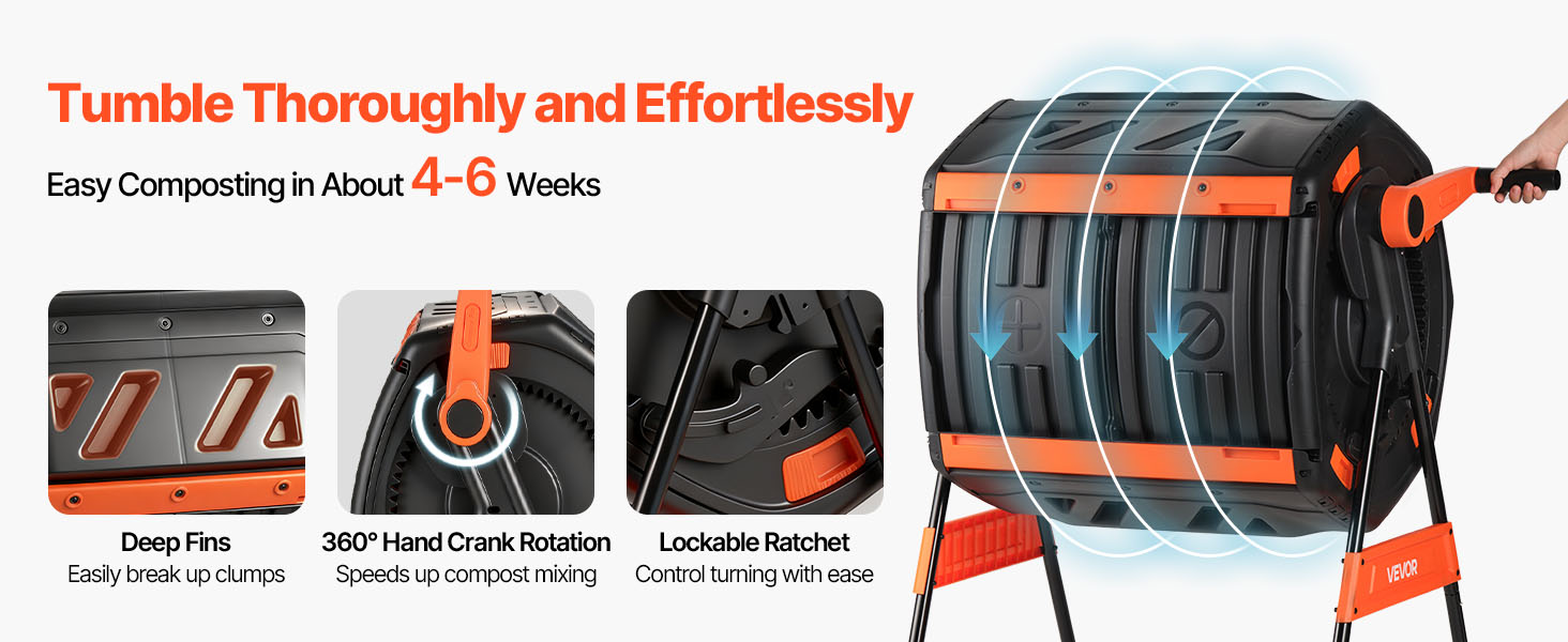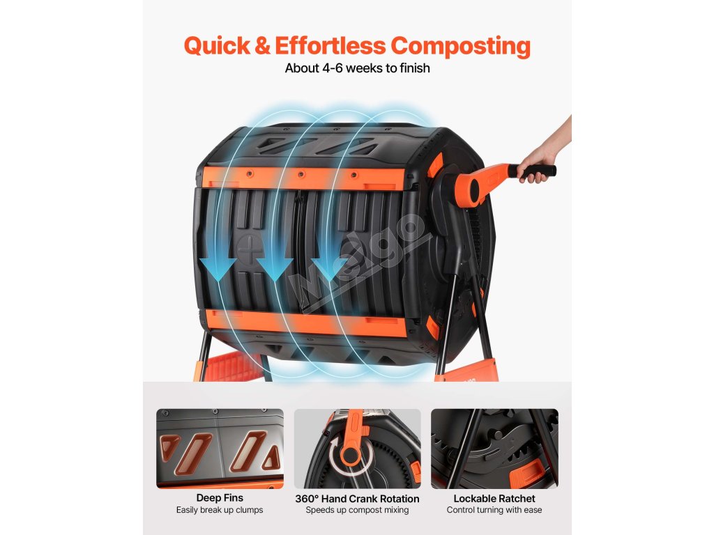 Plynulý ručný pohon a hlboký dizajn umožňujú kompostovaču rovnomerne premiešať odpad. Vstavané otvory vháňajú kyslík pre rýchlejšie a rovnomernejšie rozkladanie.