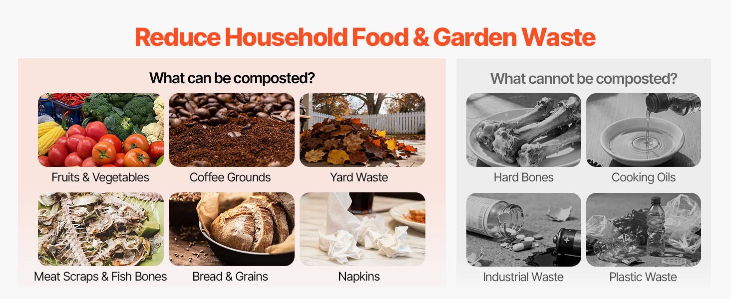 Pred vložením do vonkajšieho kompostéra nakrájajte potravinové zvyšky, aby ste urýchlili výsledky. Vyhnite sa citrusovým plodom, mäsu, mliečnym výrobkom alebo mastným potravinám. Znižuje až 90 % domového odpadu a vytvára kompost bohatý na živiny.