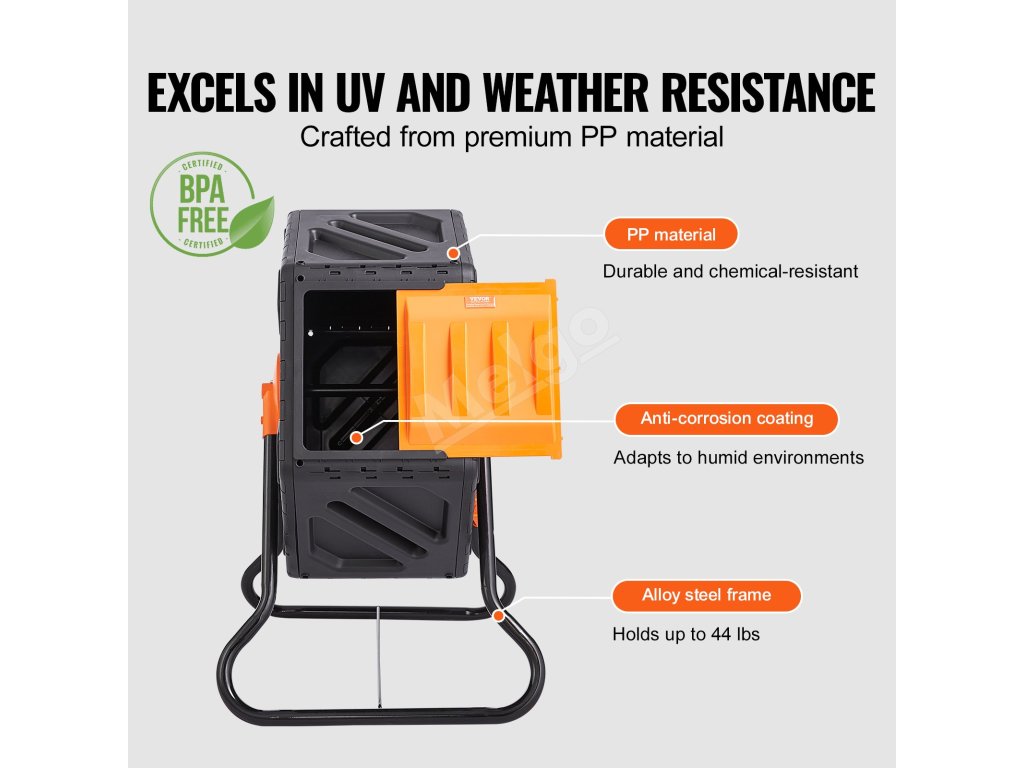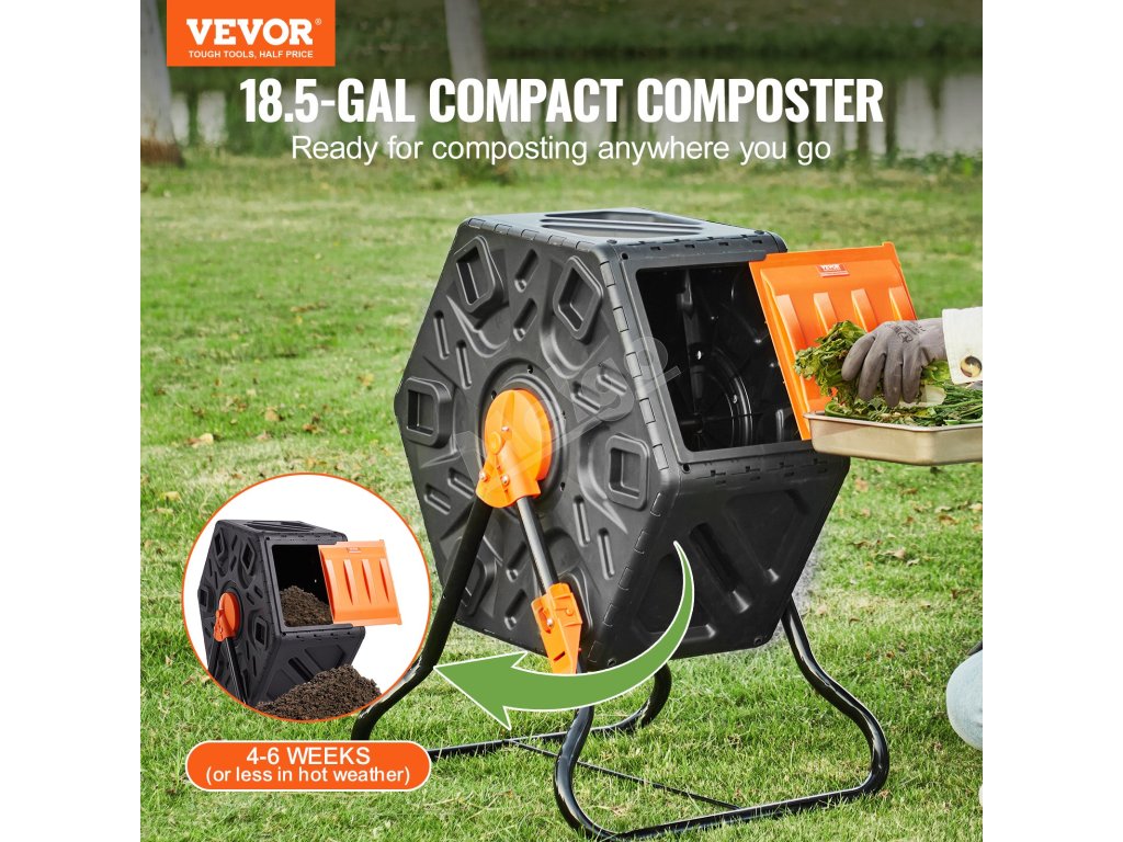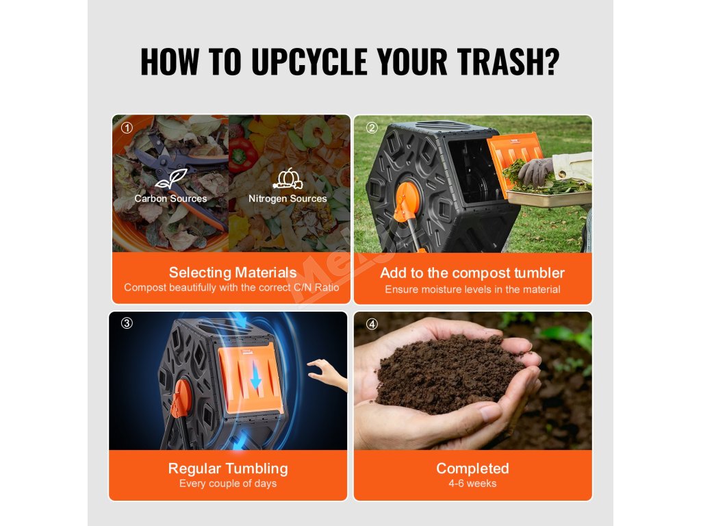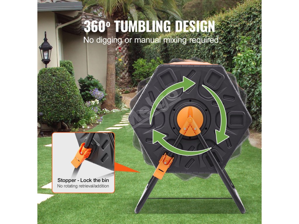 Záhradný kompostovací zásobník má 360° prevracajúci dizajn; nie je potrebné ručné miešanie. Pravidelným otáčaním sa dosahujú optimálne výsledky kompostovania, čo ponúka nevídané pohodlie pre vašu záhradkársku cestu.