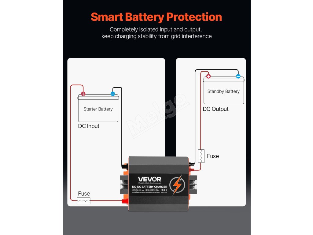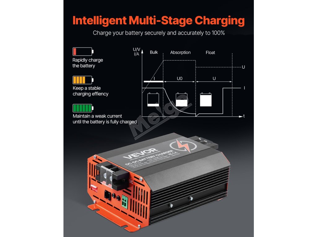 Táto nabíjačka na jednosmerný prúd využíva energiu z generátora na nabíjanie pohotovostnej batérie vášho obytného vozidla počas cesty, čím zabezpečuje nepretržité napájanie počas celej cesty.