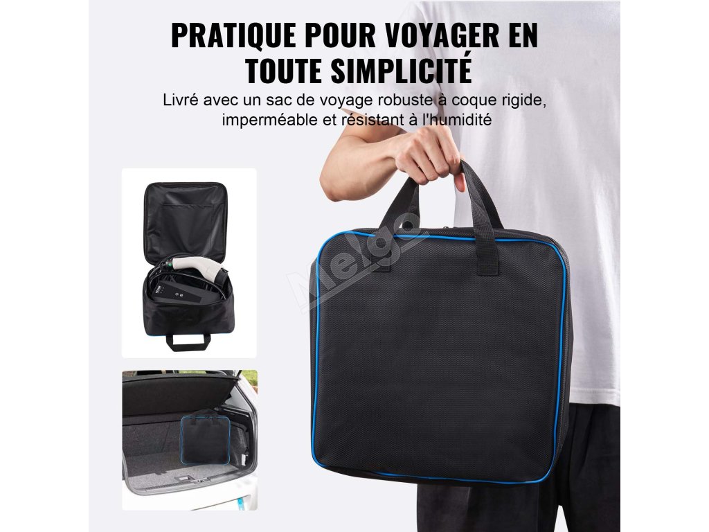 Dodávame úložnú tašku, základňu a háčik na nabíjací kábel. Môžete ho nainštalovať priamo do garáže ako pevnú nabíjaciu stanicu. Túto nabíjačku pre elektromobily si môžete vziať so sebou kamkoľvek na cesty vďaka úložnej taške. Pokiaľ je k dispozícii zásuvka, môžete svoje vozidlo pohodlne nabíjať.