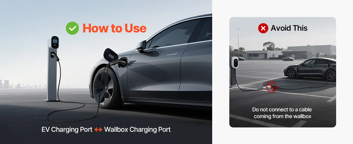 Odpoveď: Nie. Pre vašu ochranu ho pripojte priamo medzi vaše EV a nabíjaciu stanicu.