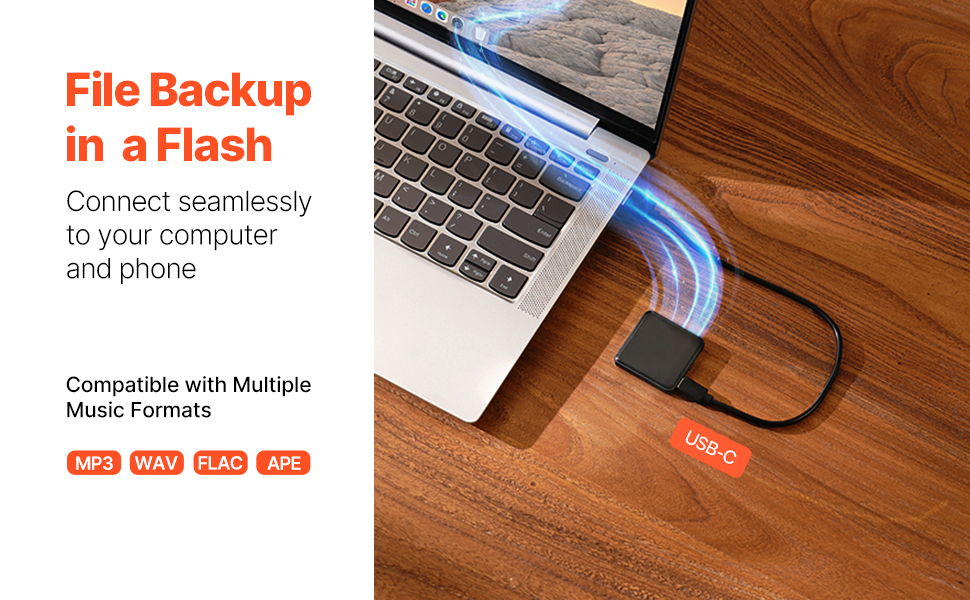 Pomocou dodaného dátového kábla tento digitálny zvukový záznamník rýchlo a bez problémov prenesie vaše nahrávky do počítača alebo smartfónu. Navyše podporuje viacero zvukových formátov, napríklad MP3, WAV, FLAC a APE. Môžete si dokonca stiahnuť svoju obľúbenú hudbu a používať ho ako prehrávač MP3.