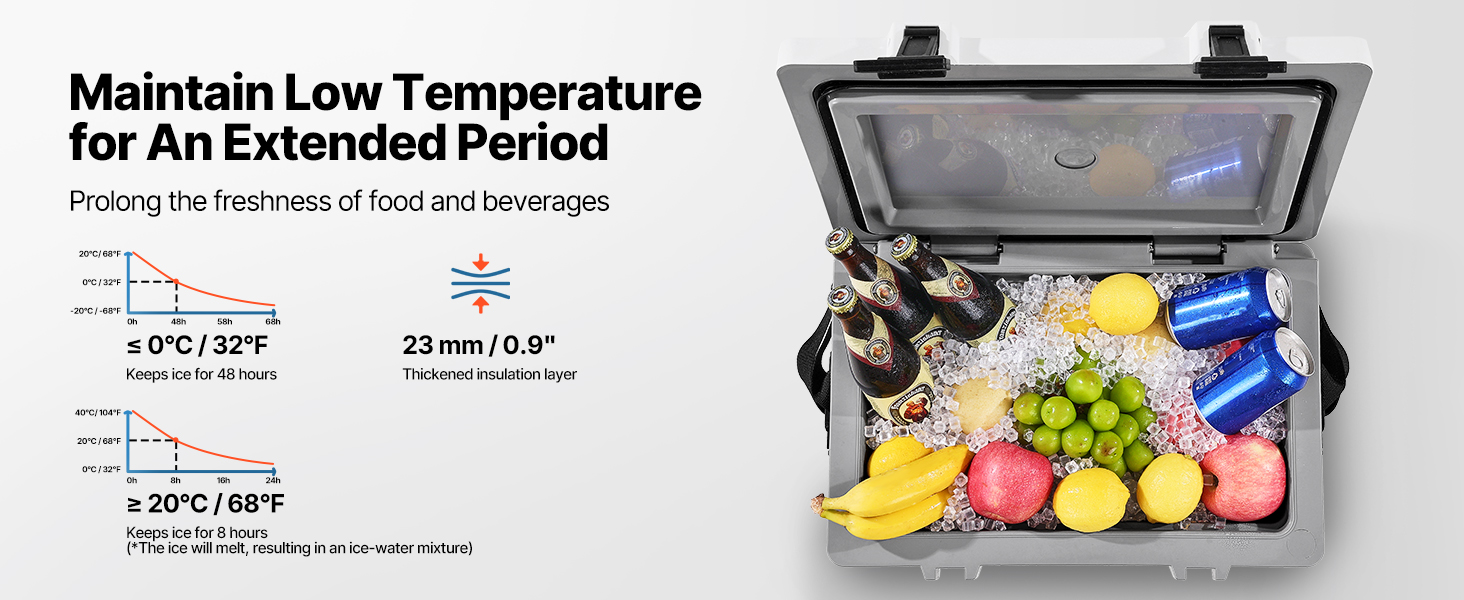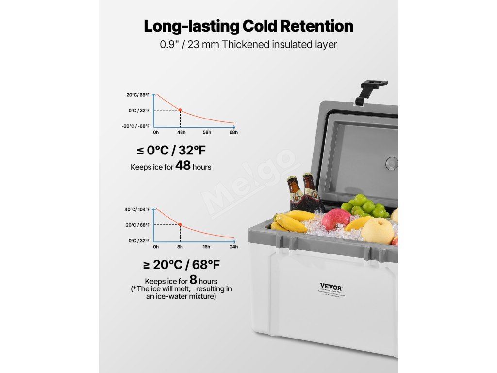Chladiaci box je vyrobený z vysokokvalitných izolačných materiálov, ktoré zabezpečujú stabilnú vnútornú teplotu. Dlhodobo udržiava nízke teploty, vďaka čomu zostávajú potraviny a nápoje dlhšie čerstvé.