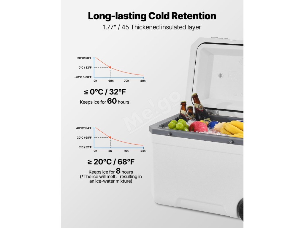 Chladiaci box je vyrobený z vysokokvalitných izolačných materiálov, ktoré zabezpečujú stabilnú vnútornú teplotu. Udržiava nízke teploty počas dlhšieho obdobia, čím udržiava potraviny a nápoje dlhšie čerstvé.