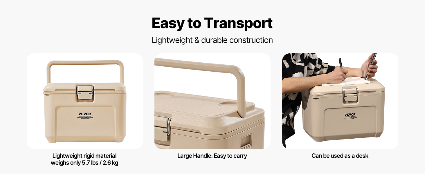 Vyrobený je z ľahkého pevného materiálu a má veľkú rukoväť na jednoduché prenášanie. Pre väčšie pohodlie môže slúžiť aj ako stolík.