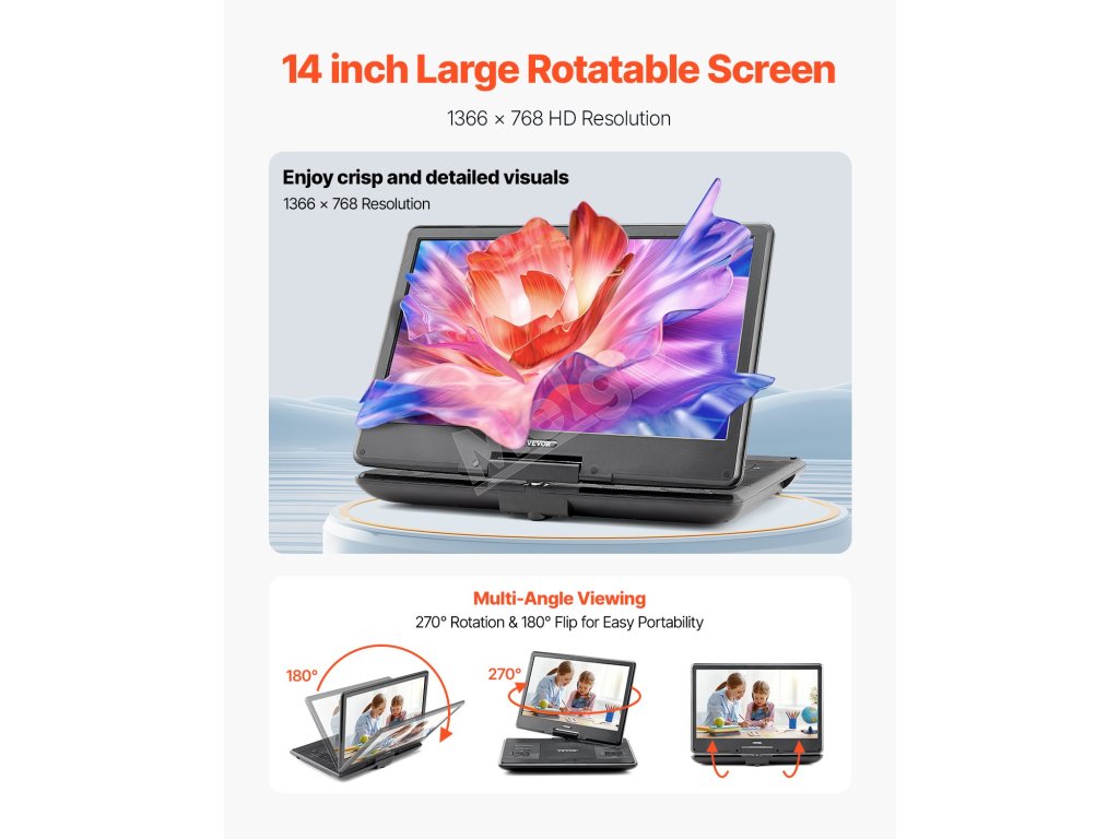 Prenosný dvd prehrávač 14 inch hd, 4,5–5 h, usb/sd, diaľkové ovládanie