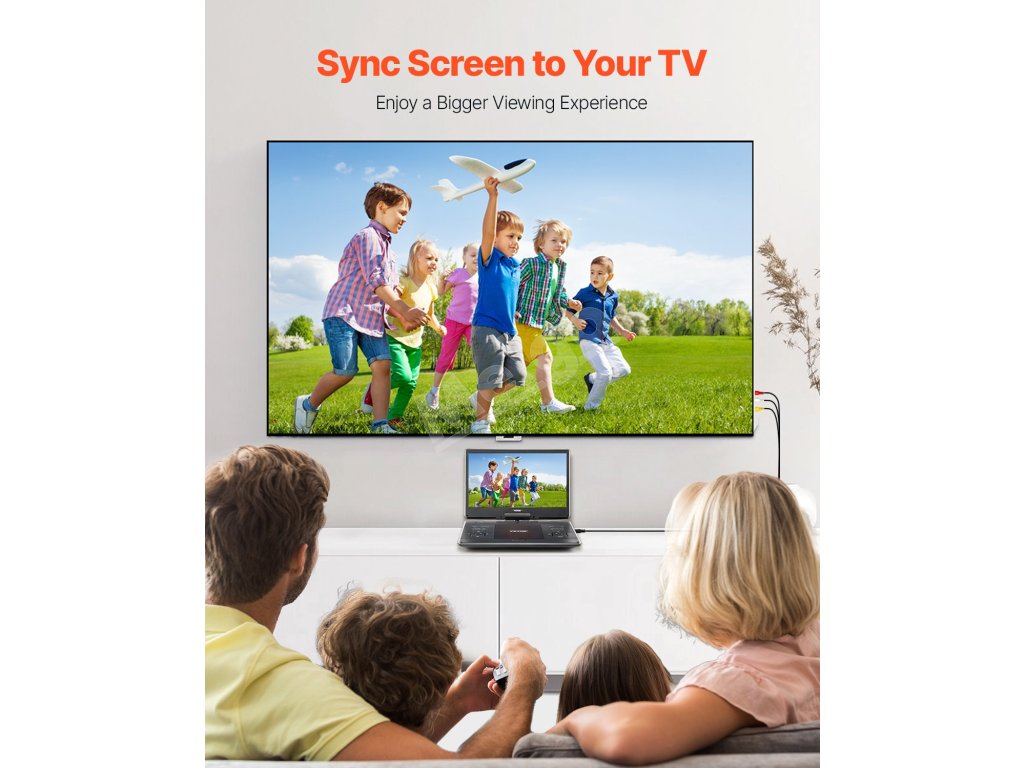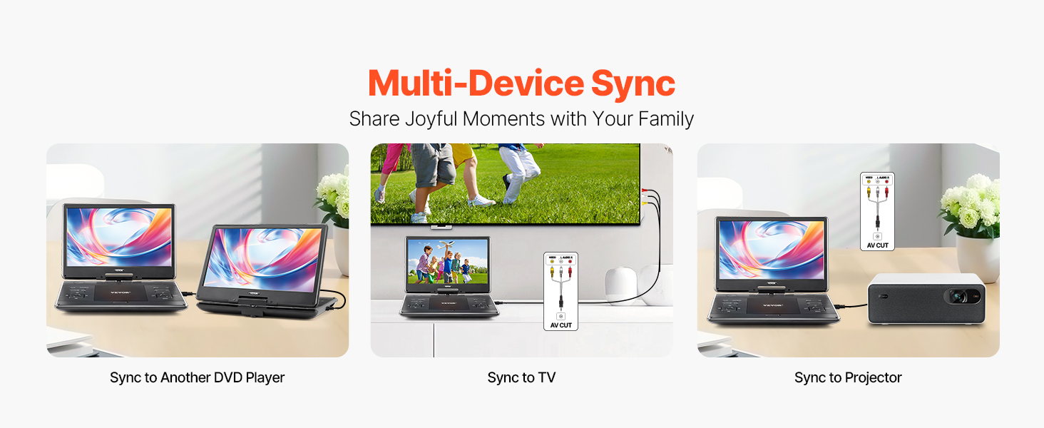 Vďaka AV výstupu môžete obrazovku zariadenia jednoducho synchronizovať s iným DVD prehrávačom rovnakého modelu, televízorom alebo projektorom na spoločné sledovanie. Užite si viac zábavy s rodinou a priateľmi prostredníctvom zábavy na viacerých obrazovkách.