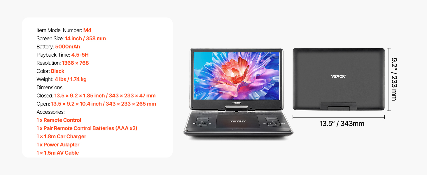 Tento prenosný DVD prehrávač so 14-palcovou HD obrazovkou (rozlíšenie 1366 x 768) a výdržou batérie 4,5-5 hodín vám umožní vychutnať si ostrý obraz a dlhé sledovanie. Duálne reproduktory sa postarajú o pohlcujúci zvuk a podpora viacerých formátov splní vaše multimediálne potreby. Funkcia synchronizácie obrazovky uľahčuje zdieľanie obsahu.
