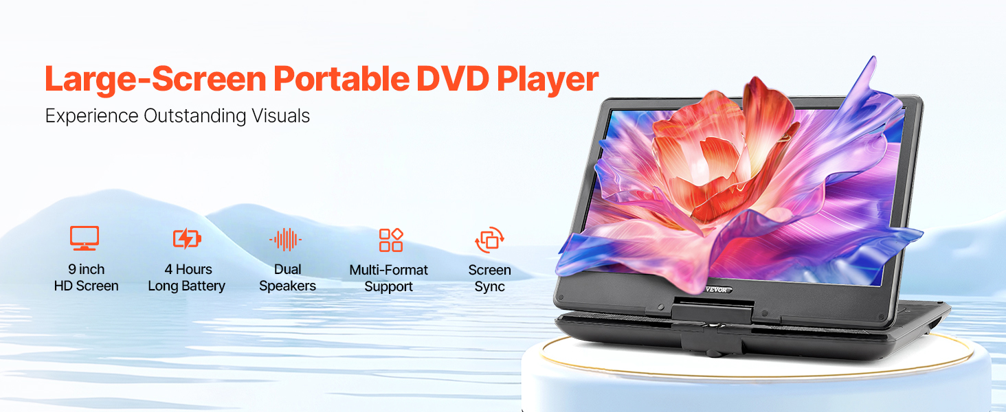 Tento cestovný DVD prehrávač je kompatibilný s diskami všetkých regiónov vrátane DVD, DVD±R, DVD±RW, VCD, CD, CD-R, CD-RW, CVD a SVCD. Podporuje tiež karty USB a SD (až do 32 GB, video v rozlíšení 1024 x 600 HD) a formáty, ako sú MPEG1, MPEG2, MPEG4 pre video, MP3, WMA pre zvuk a JPEG, JPG pre fotografie.