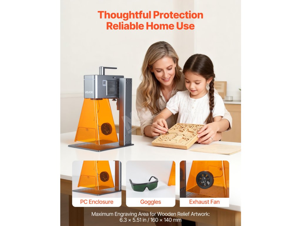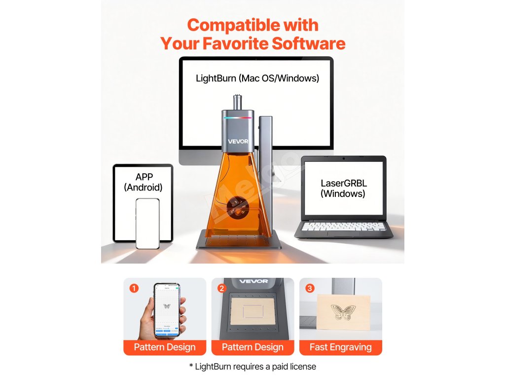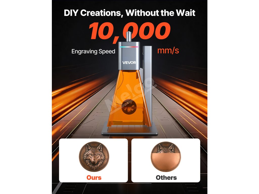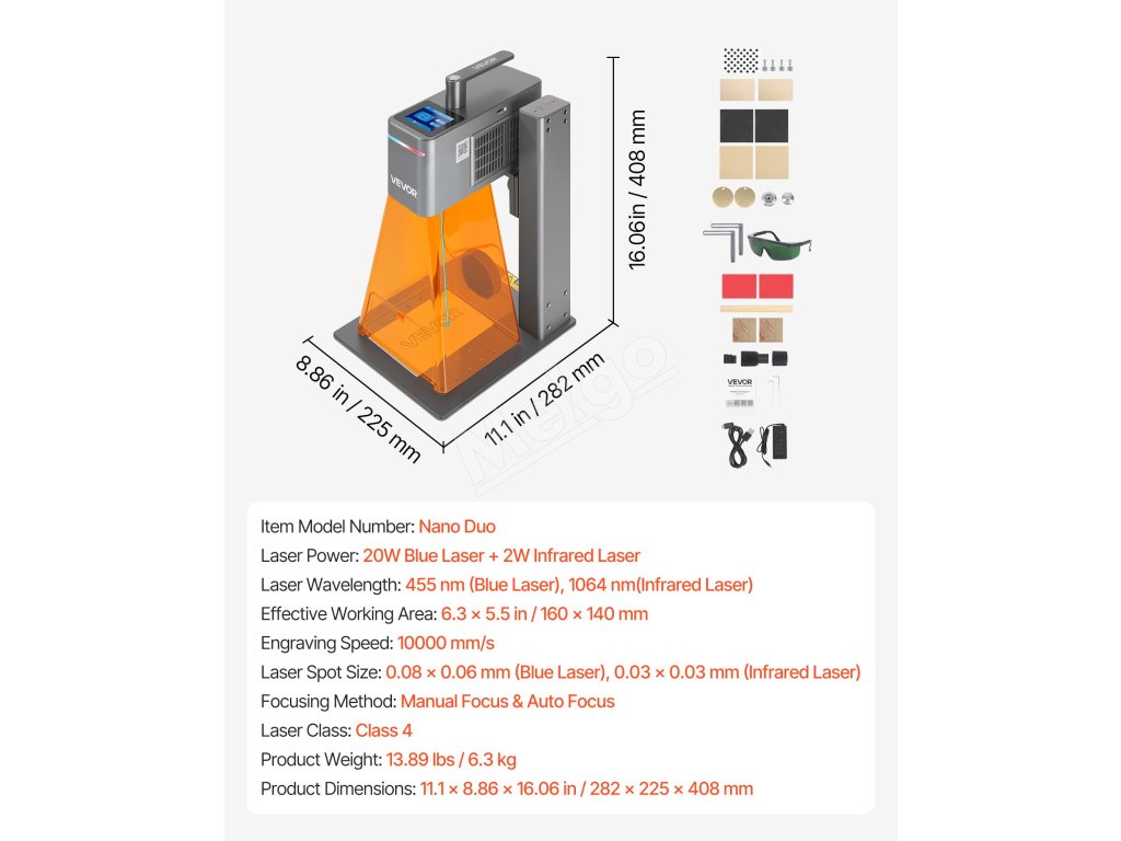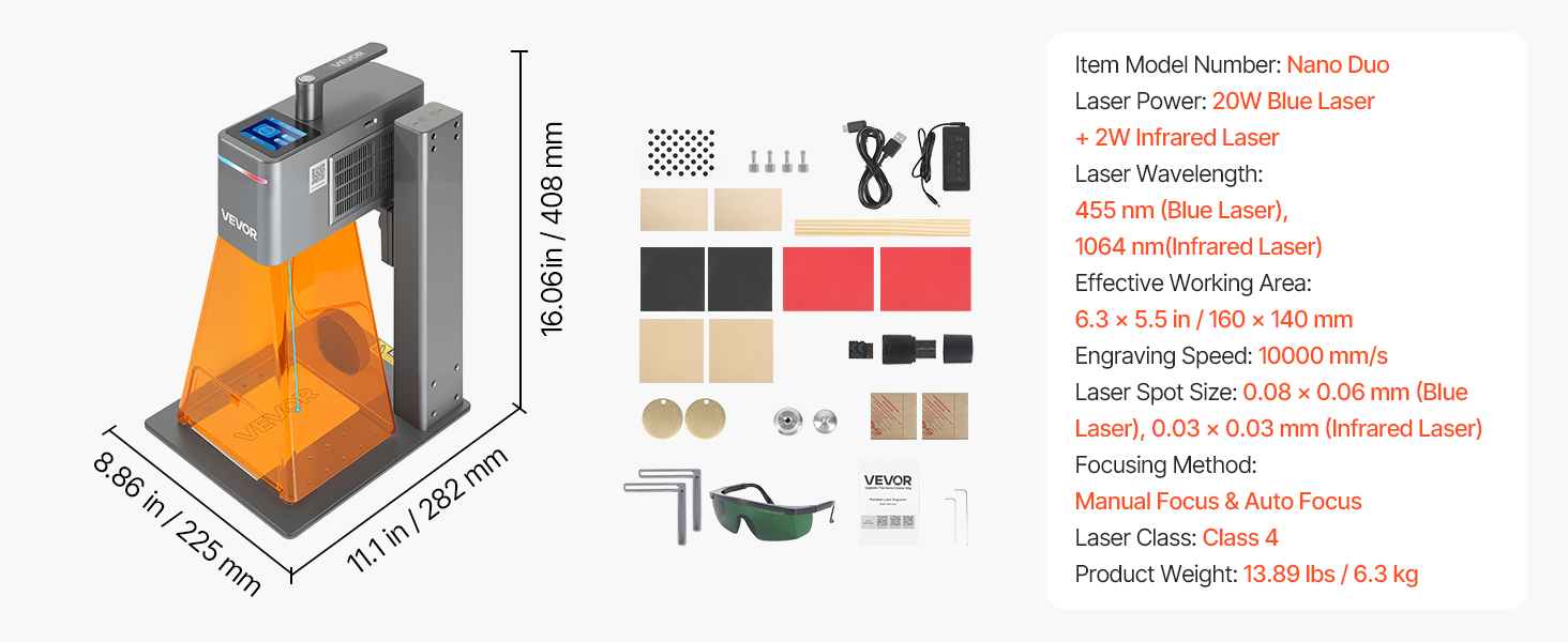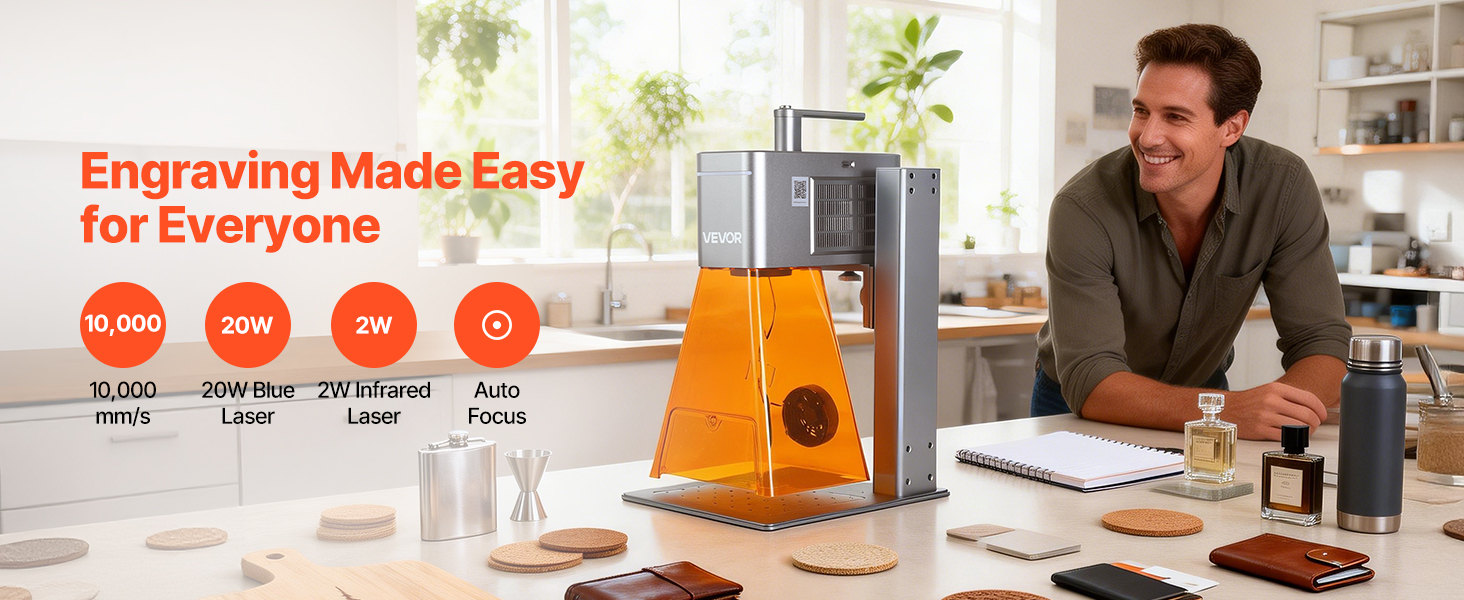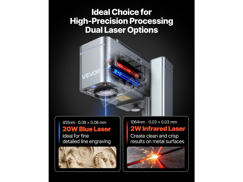 S rýchlosťou gravírovania až 10 000 mm/s, 20 W modrým laserom, 2 W infračerveným laserom a funkciou automatického zaostrovania je táto prenosná laserová gravírovačka ľahko ovládateľná. Poznámka: Transparentné alebo odrazové materiály vyžadujú pred gravírovaním čierny náter.