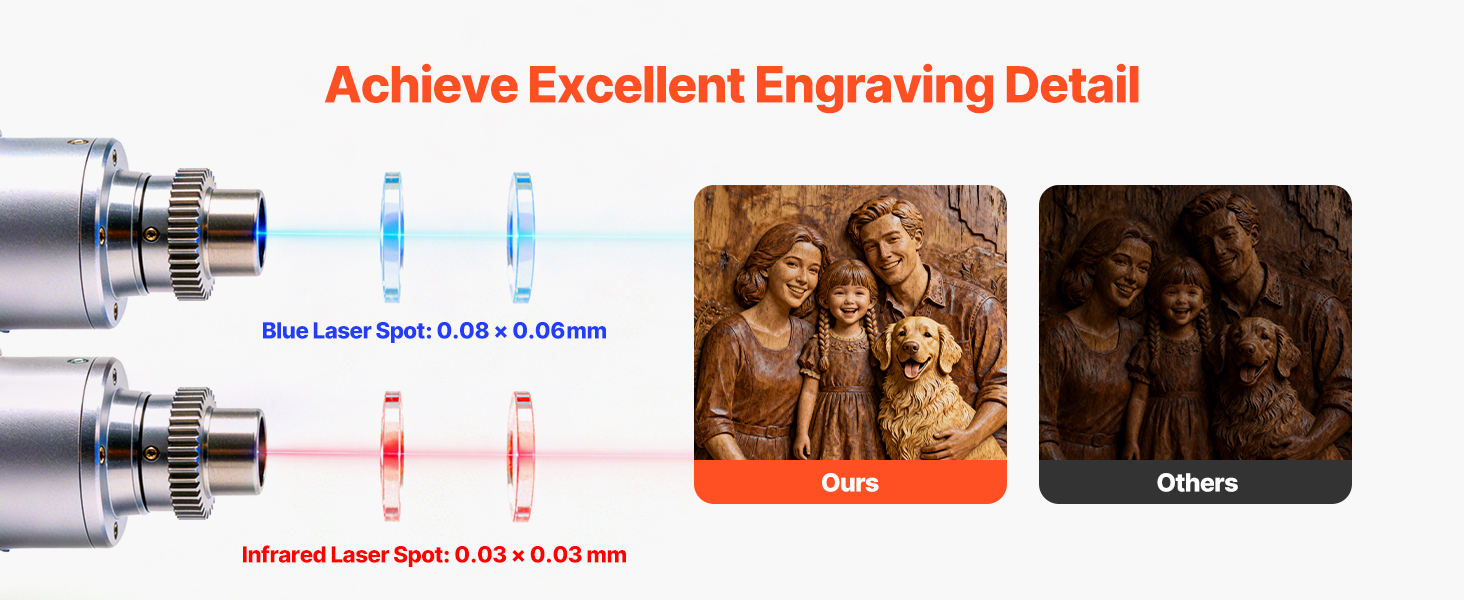 S modrým laserovým bodom 0,08 x 0,06 mm a infračerveným laserovým bodom 0,03 x 0,03 mm poskytuje tento prenosný gravírovací stroj rozlíšenie na úrovni detailov pre mimoriadne presné gravírovanie.