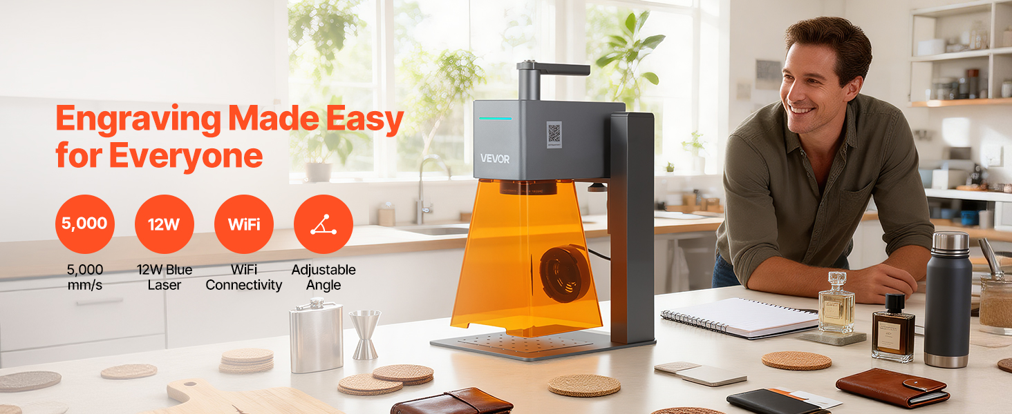 Tento prenosný laserový gravír má rýchlosť gravírovania 5 000 mm/s a 12 W modrý laser pre jemné gravírovanie. Vďaka pripojeniu WiFi a nastaviteľnému uhlu môžu aj začiatočníci ľahko vytvárať dokonale spracované projekty. Transparentné alebo reflexné materiály vyžadujú pred gravírovaním čierny náter.