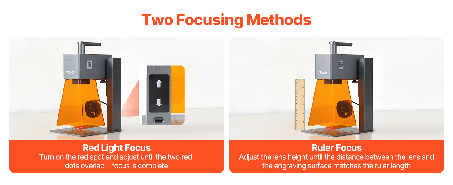 Naše ručné laserové gravírovacie zariadenie umožňuje zaostrenie nastavením výšky objektívu alebo jednoduchým zapnutím červenej bodky pre rýchle vyrovnanie. Jednoduché, intuitívne a vhodné pre začiatočníkov.