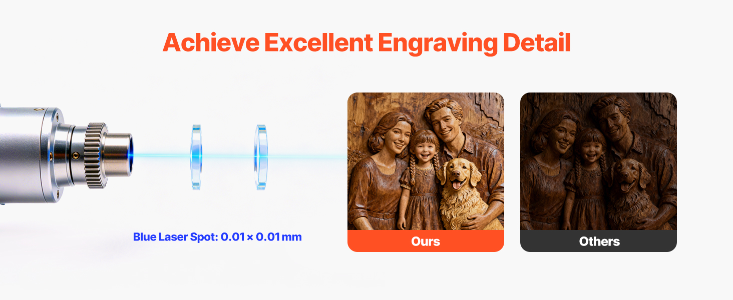 Tento prenosný gravírovací stroj dosahuje rozlíšenie na úrovni detailov s modrým laserovým bodom 0,08 x 0,06 mm, čím zachytáva jemné detaily s jasnosťou.