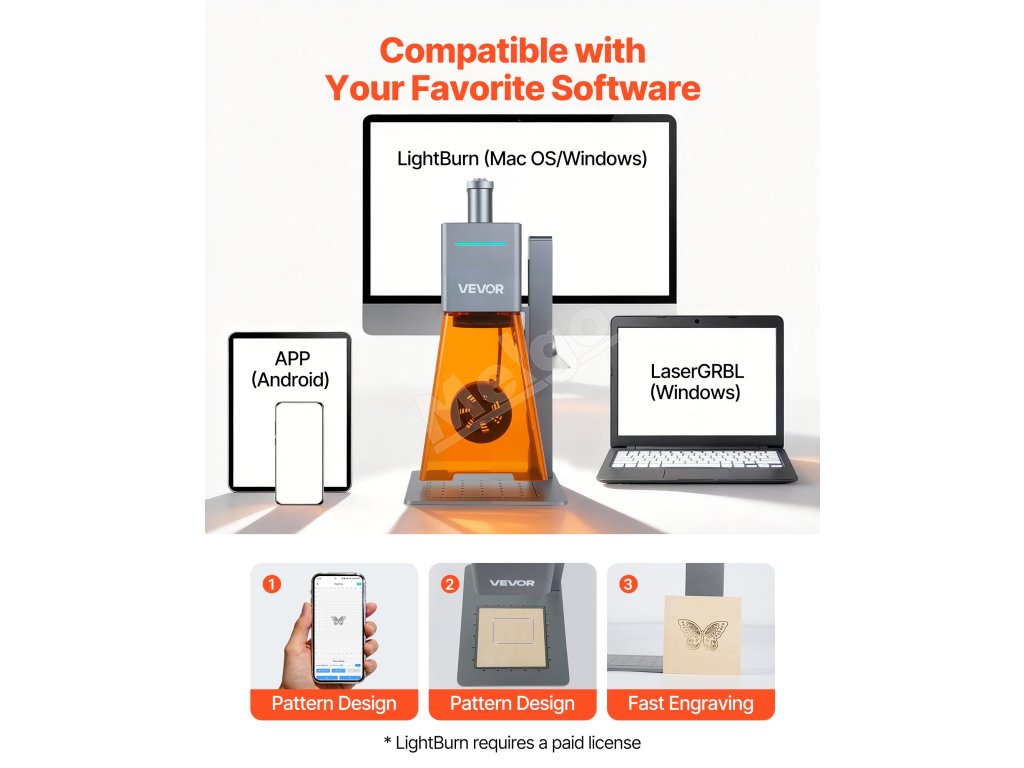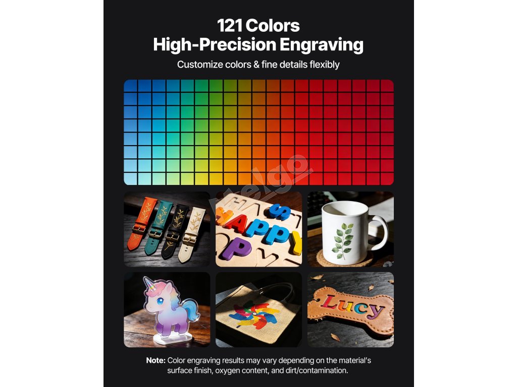Tento prenosný laserový gravír má rýchlosť gravírovania 5 000 mm/s a 12 W modrý laser pre jemné gravírovanie. Vďaka pripojeniu WiFi a nastaviteľnému uhlu môžu aj začiatočníci ľahko vytvárať dokonale spracované projekty. Transparentné alebo reflexné materiály vyžadujú pred gravírovaním čierny náter.