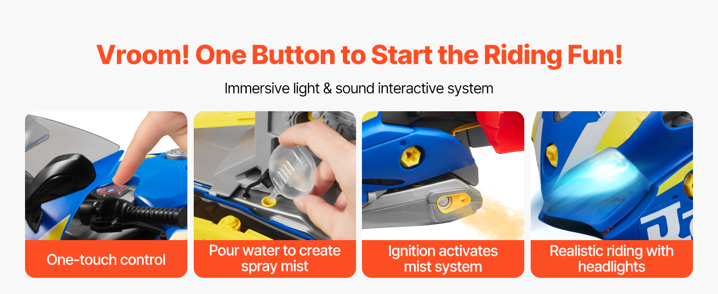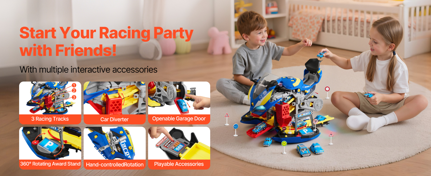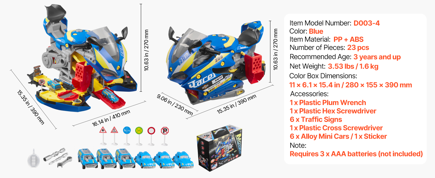Otvorte karosériu motocykla a odkryte dve pretekárske dráhy. Deti môžu súťažiť s kamarátmi pomocou interaktívnych častí, 6 miniatúrnych autíčok a 6 dopravných značiek. Nápaditá hra sa stretáva s priateľskými pretekárskymi výzvami v jednej hračke.