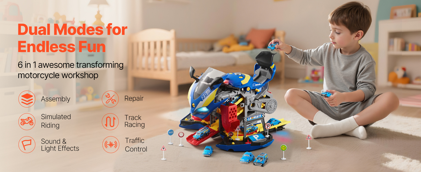 Táto sada hračiek pre mechanikov motocyklov ponúka nekonečnú zábavu so 6 hernými režimami: montáž, oprava, simulácia jazdy, preteky, riadenie dopravy a zvukovo-svetelné efekty. Deti si budujú praktické zručnosti a zároveň objavujú kreativitu celé hodiny.