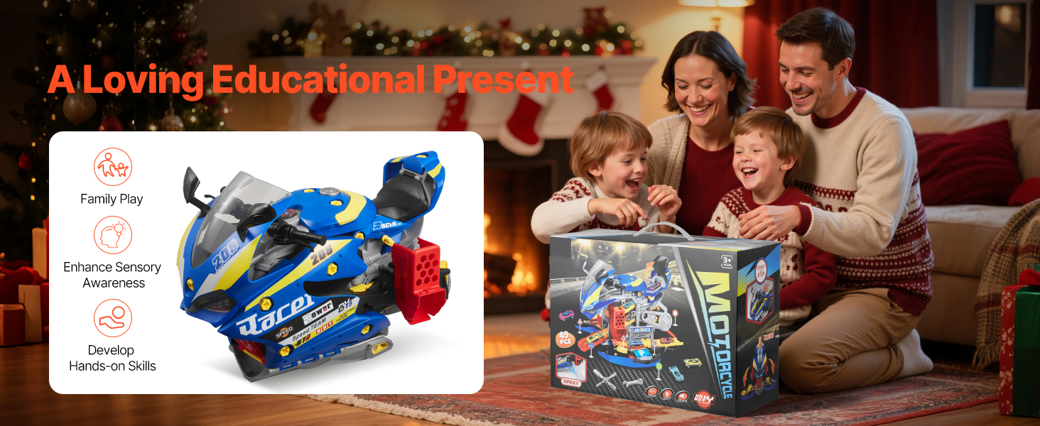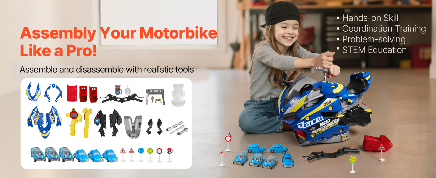 Nechajte deti preskúmať, ako funguje motorka! Celá hračka motora sa dá rozobrať a opäť zložiť, pričom realistické nástroje napodobňujú dielňu. Je to zábavná hračka STEM, ktorá zavádza riešenie problémov a mechanické myslenie.