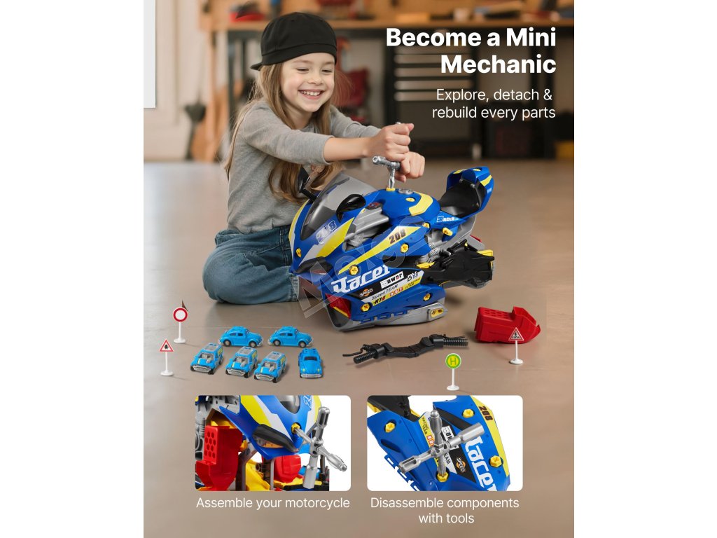 Nechajte deti preskúmať, ako funguje motorka! Celá hračka motora sa dá rozobrať a opäť zložiť, pričom realistické nástroje napodobňujú dielňu. Je to zábavná hračka STEM, ktorá zavádza riešenie problémov a mechanické myslenie.