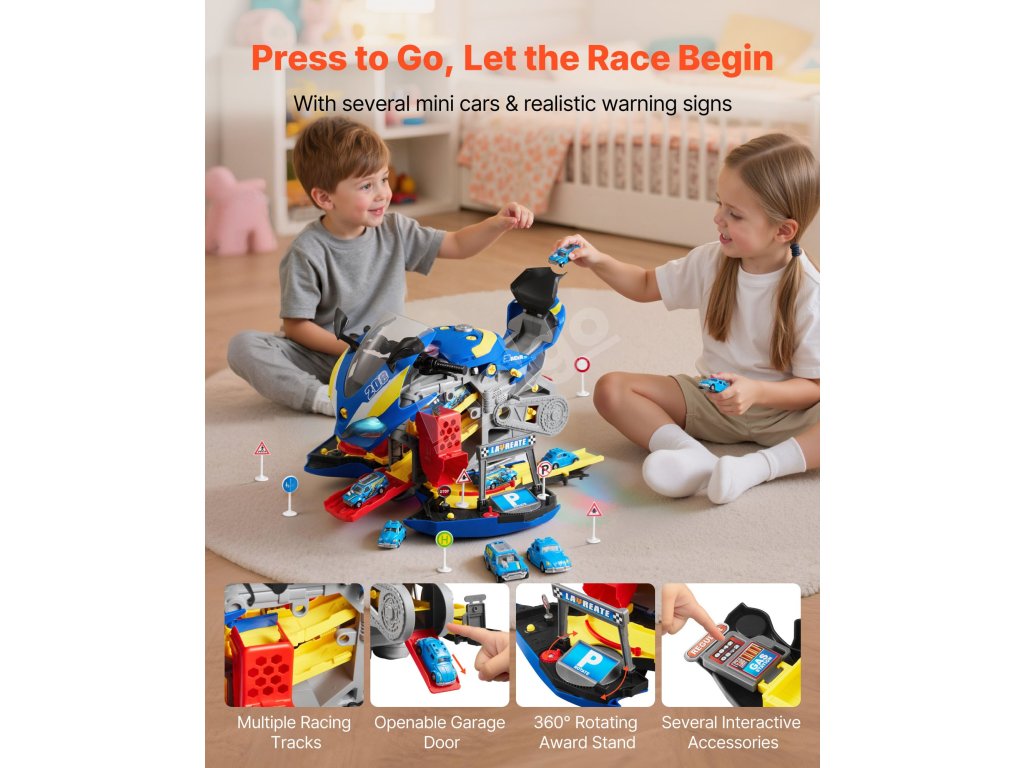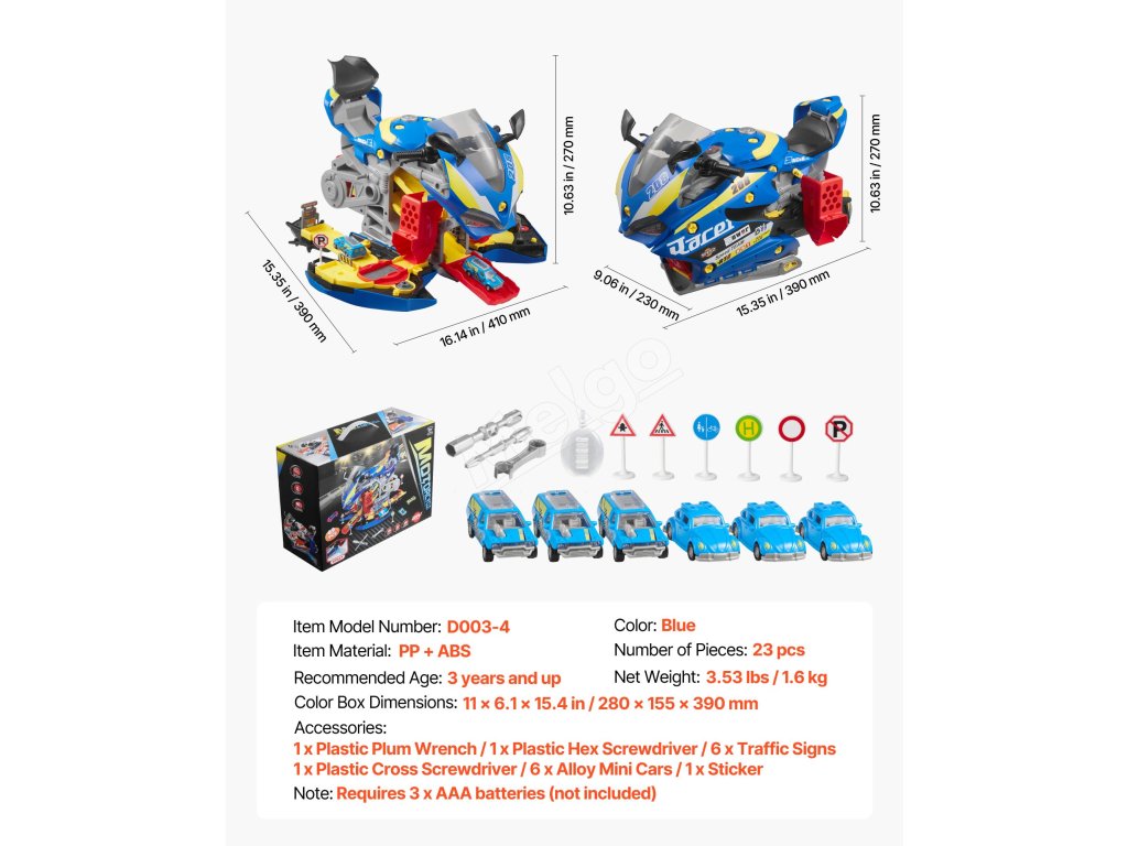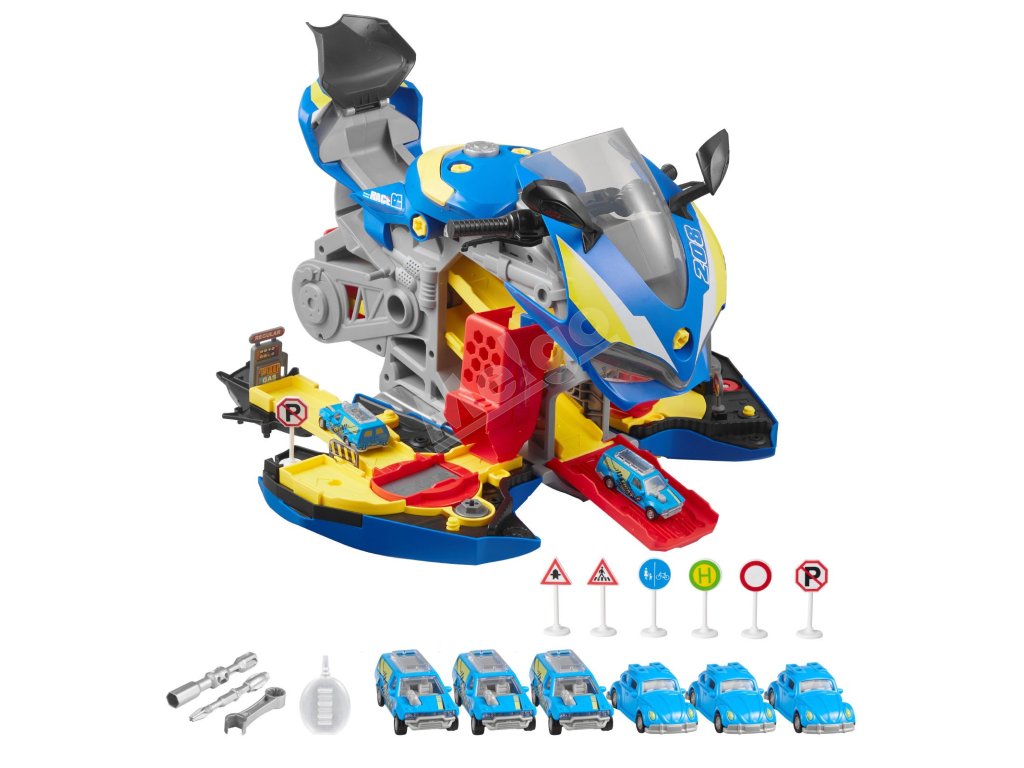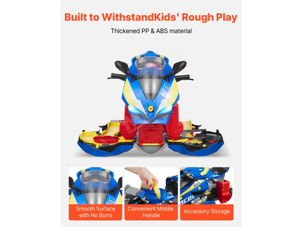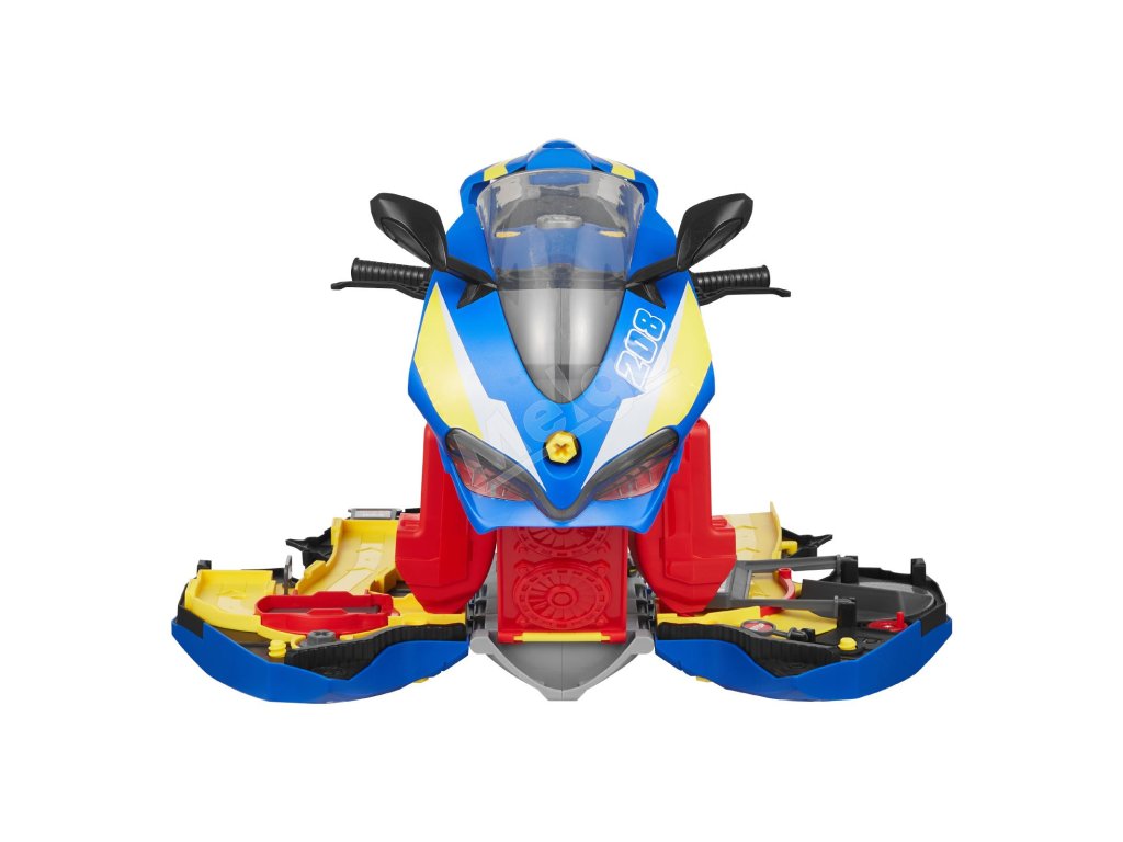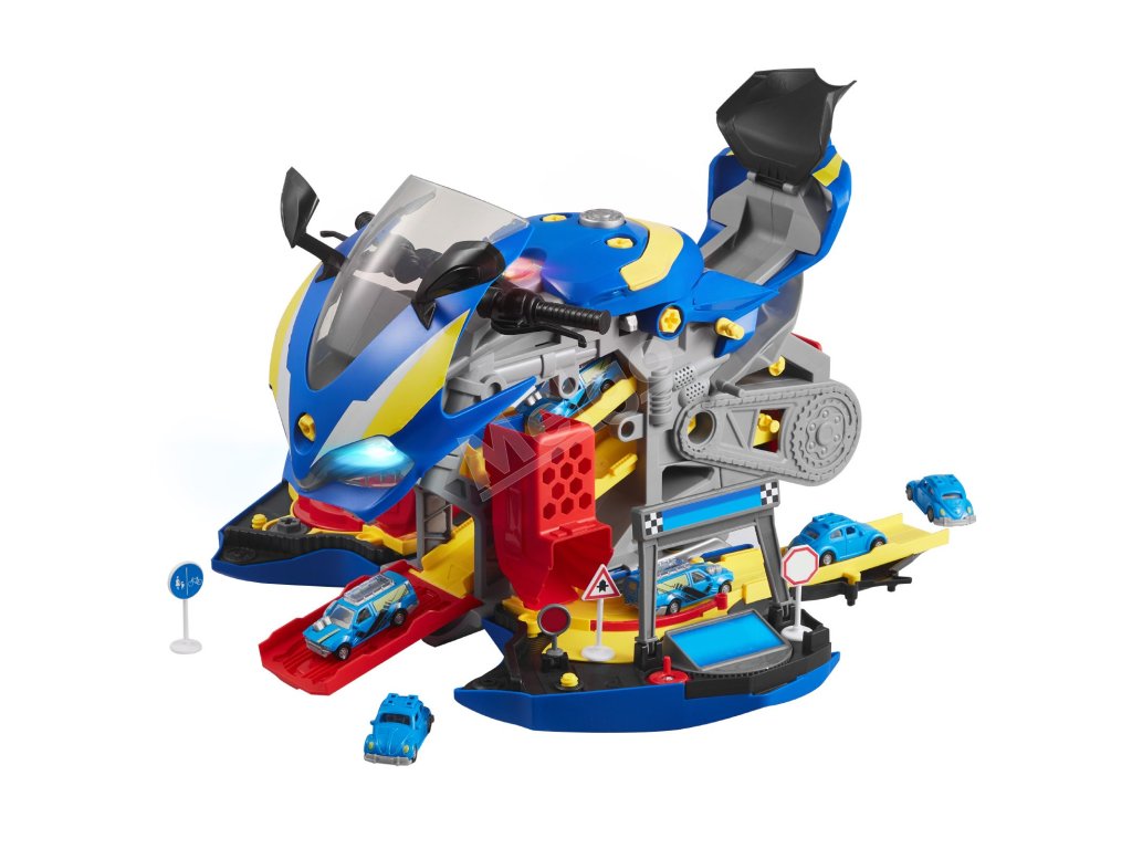 Otvorte karosériu motocykla a odkryte dve pretekárske dráhy. Deti môžu súťažiť s kamarátmi pomocou interaktívnych častí, 6 miniatúrnych autíčok a 6 dopravných značiek. Nápaditá hra sa stretáva s priateľskými pretekárskymi výzvami v jednej hračke.