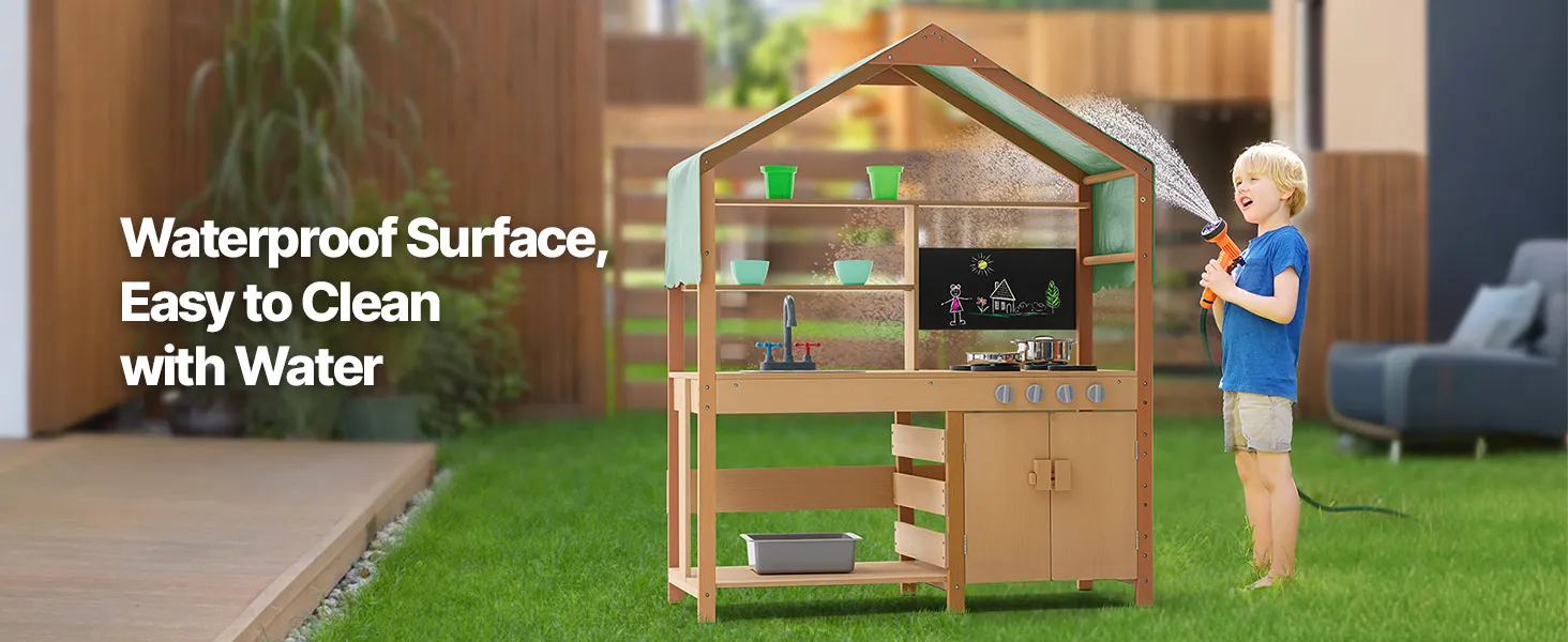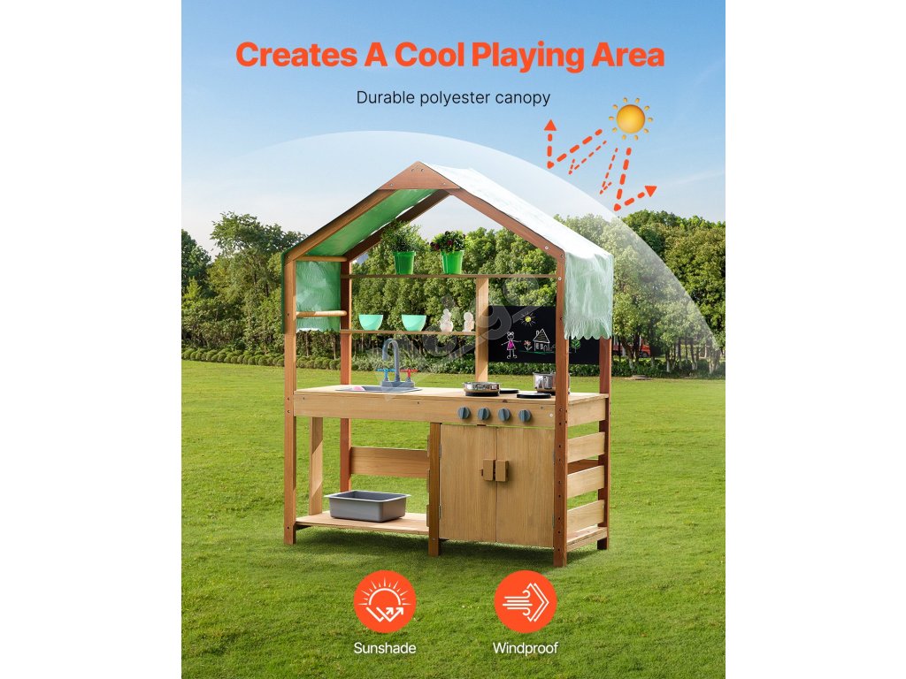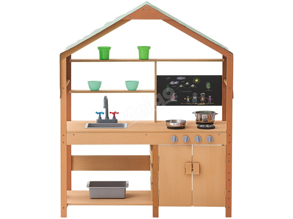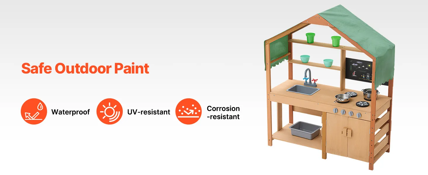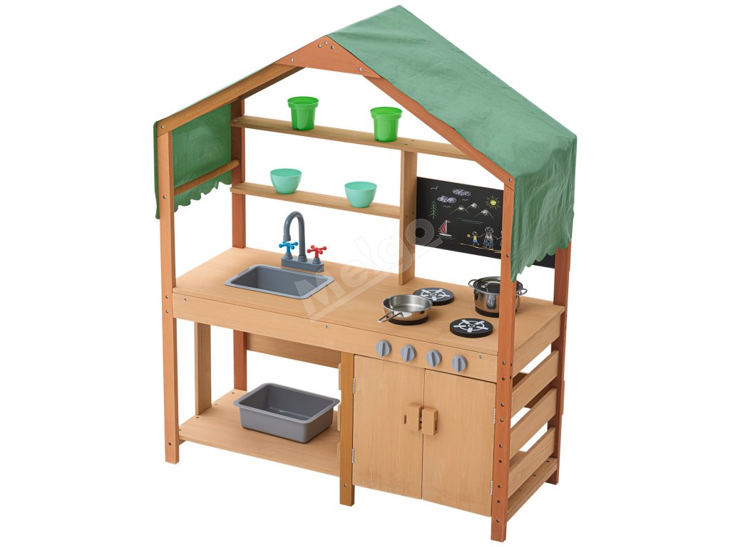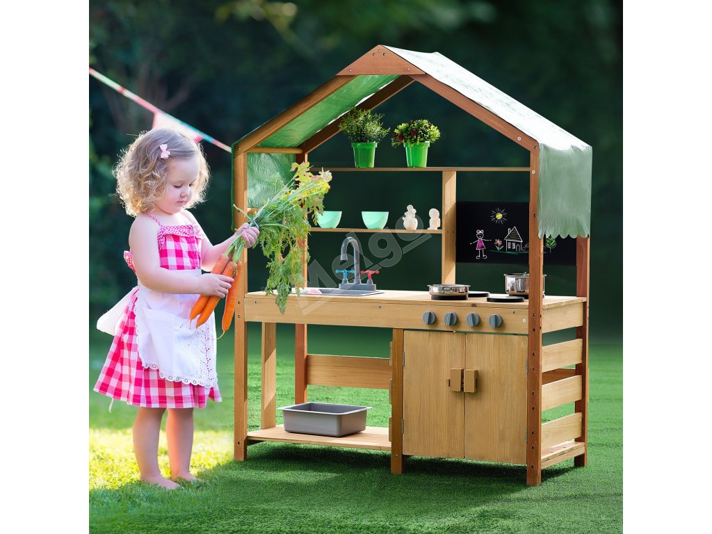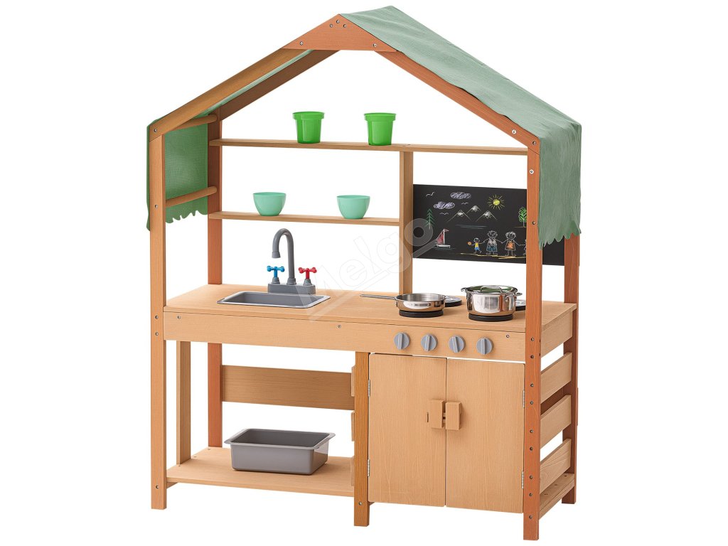 Táto kuchynka pre batoľatá je ošetrená vonkajšou farbou odolnou voči vode a korózii a poskytuje deťom tienistý priestor na hranie. Je ideálna na použitie v záhradách, na dvoroch a trávnikoch.
