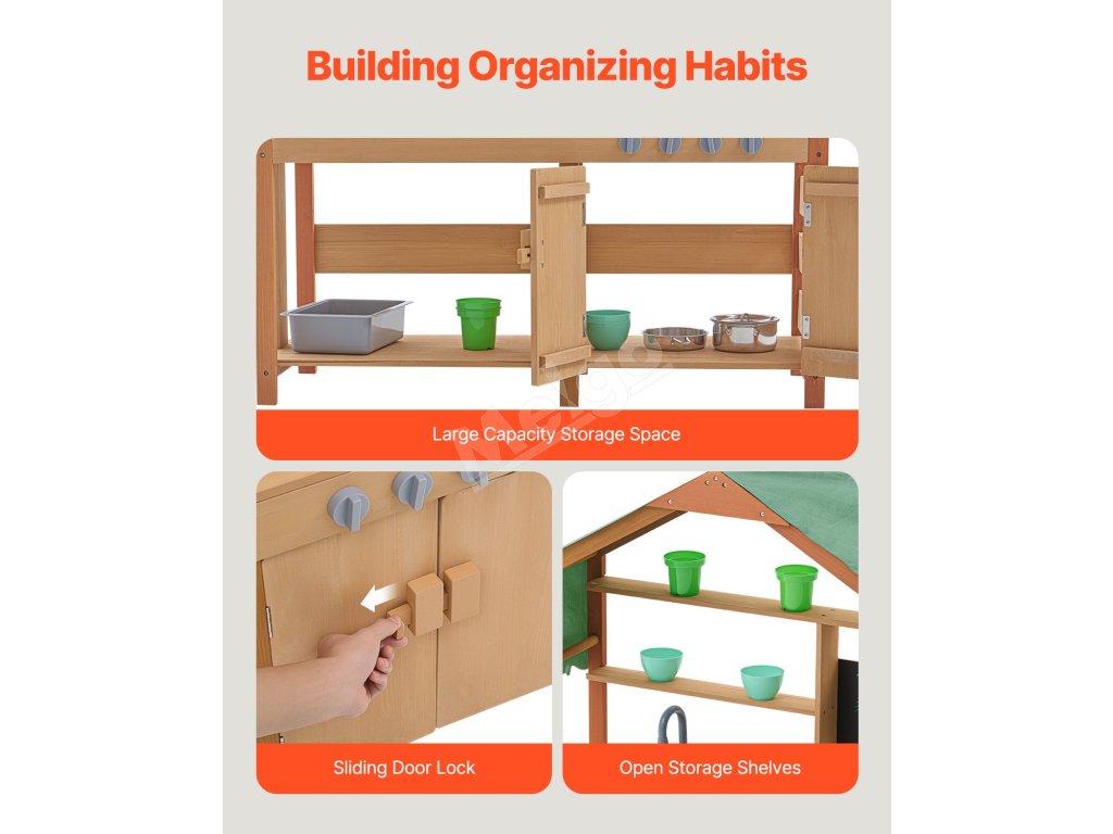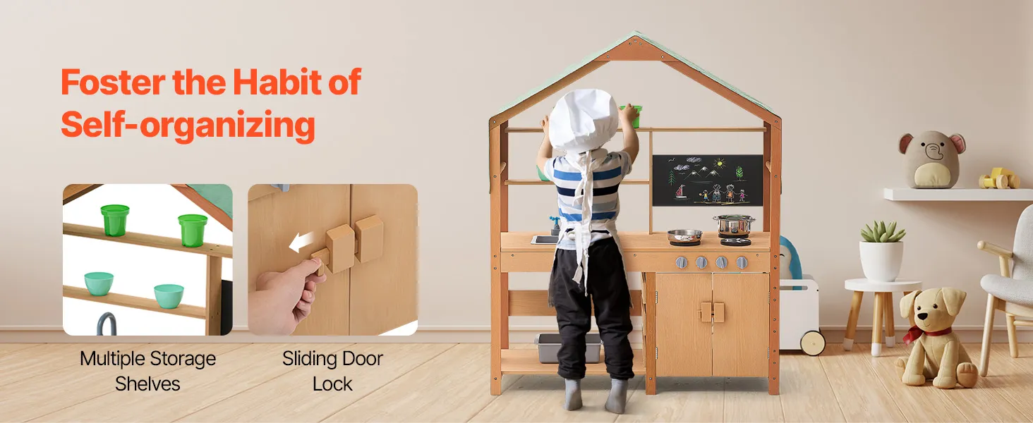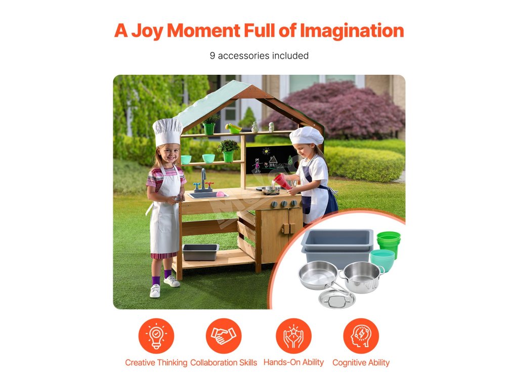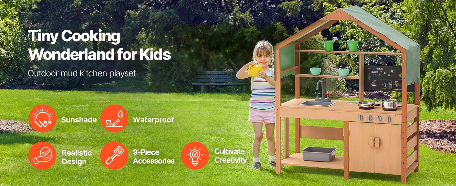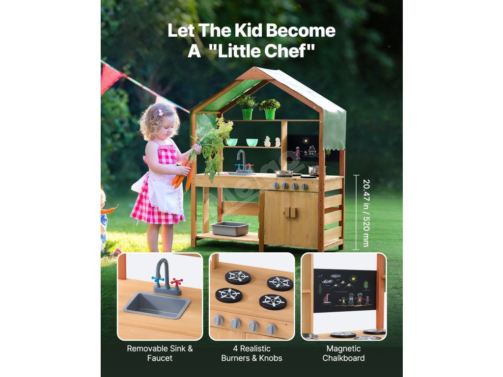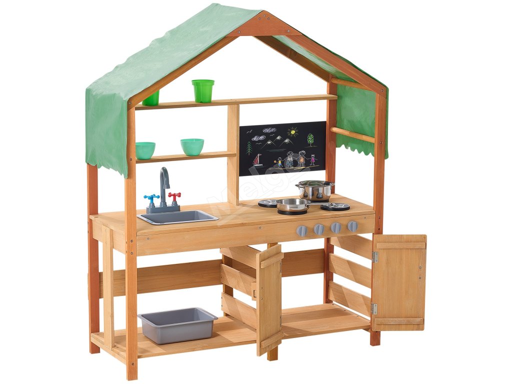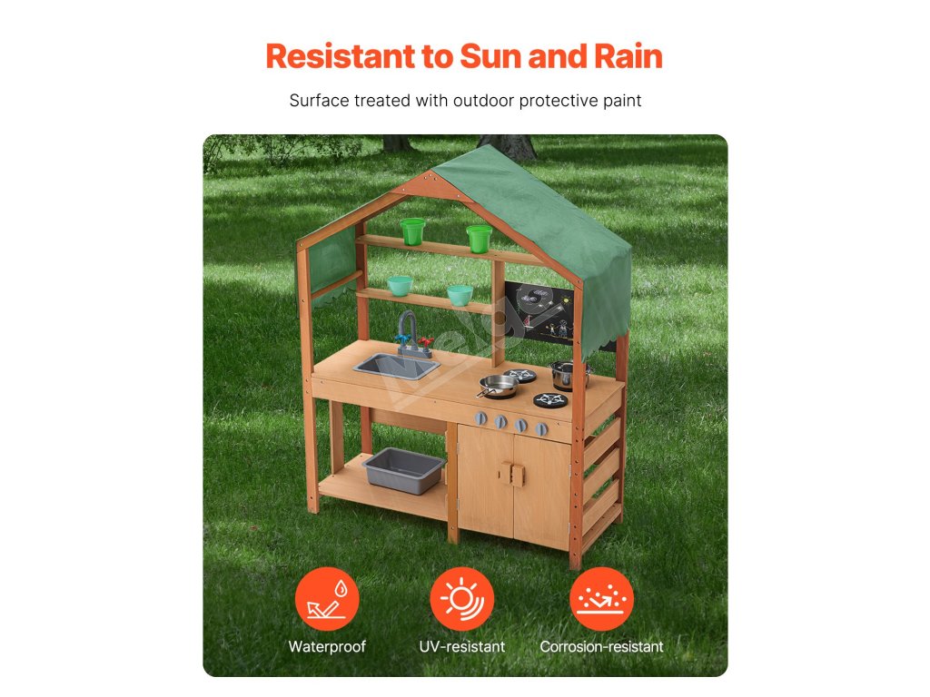 Táto kuchynka pre batoľatá je ošetrená vonkajšou farbou odolnou voči vode a korózii a poskytuje deťom tienistý priestor na hranie. Je ideálna na použitie v záhradách, na dvoroch a trávnikoch.