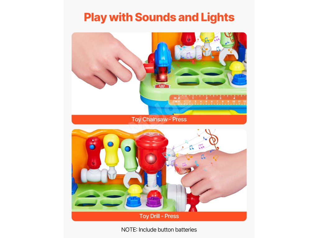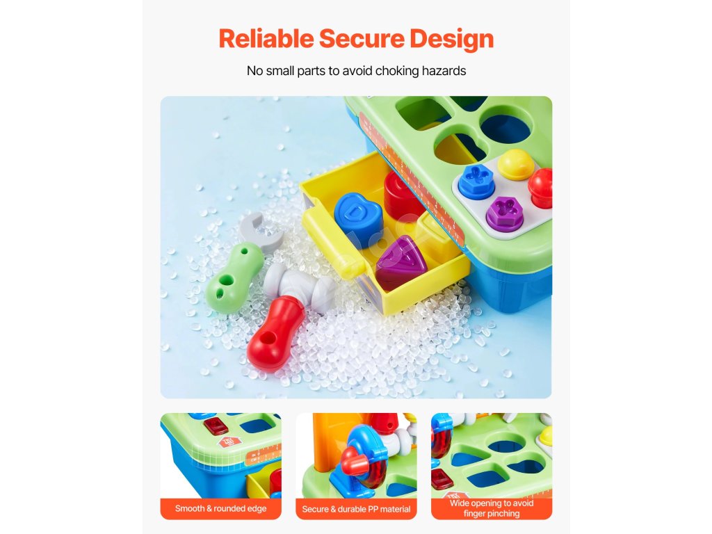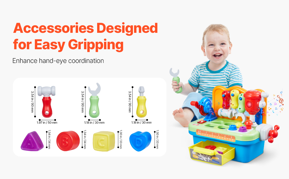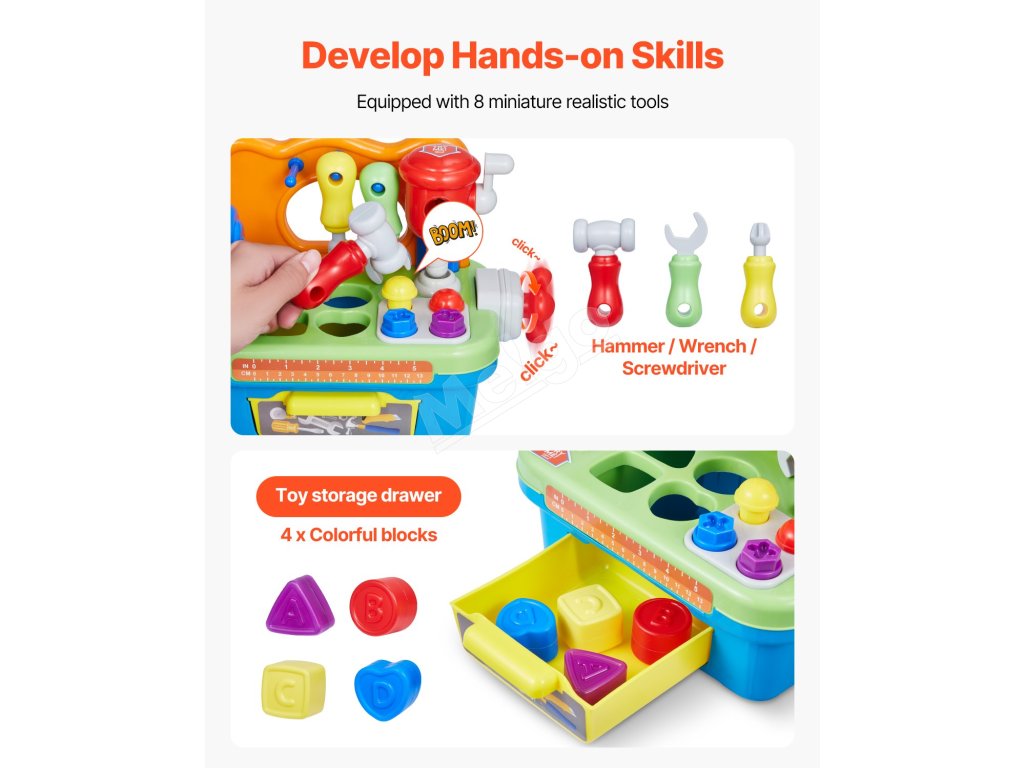 Hudobný vzdelávací pracovný stôl sa dodáva s 3 realistickými nástrojmi (skrutkovač, kľúč, kladivo) a 4 farebnými blokmi v zábavných tvaroch, ako sú štvorce, trojuholníky, srdiečka a kruhy. Ideálne pre malé rúčky na posilnenie úchopu pri bezpečnej hre.