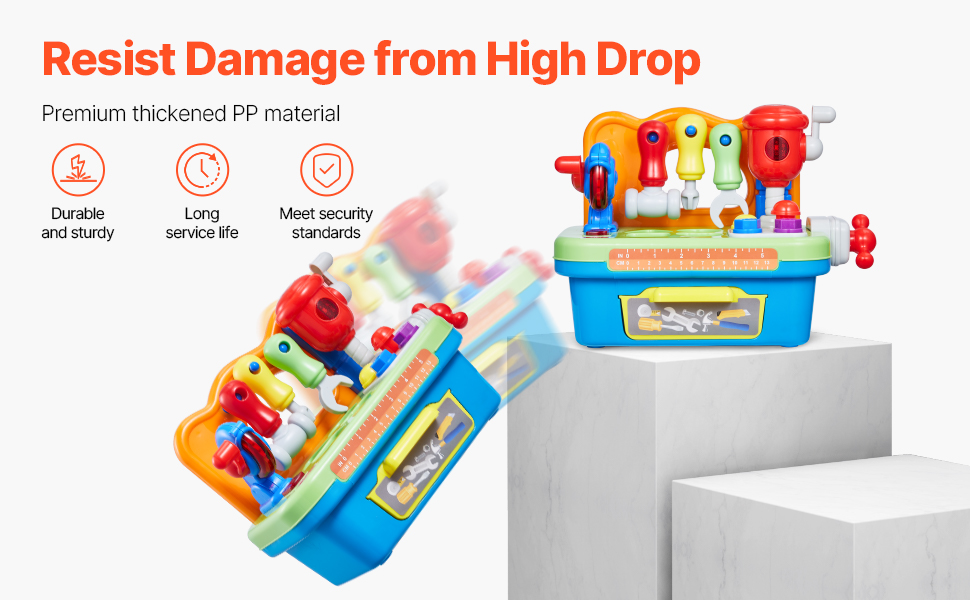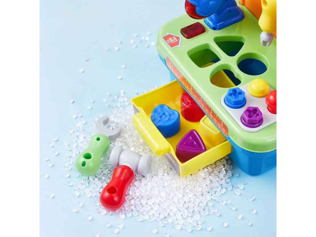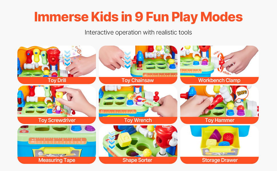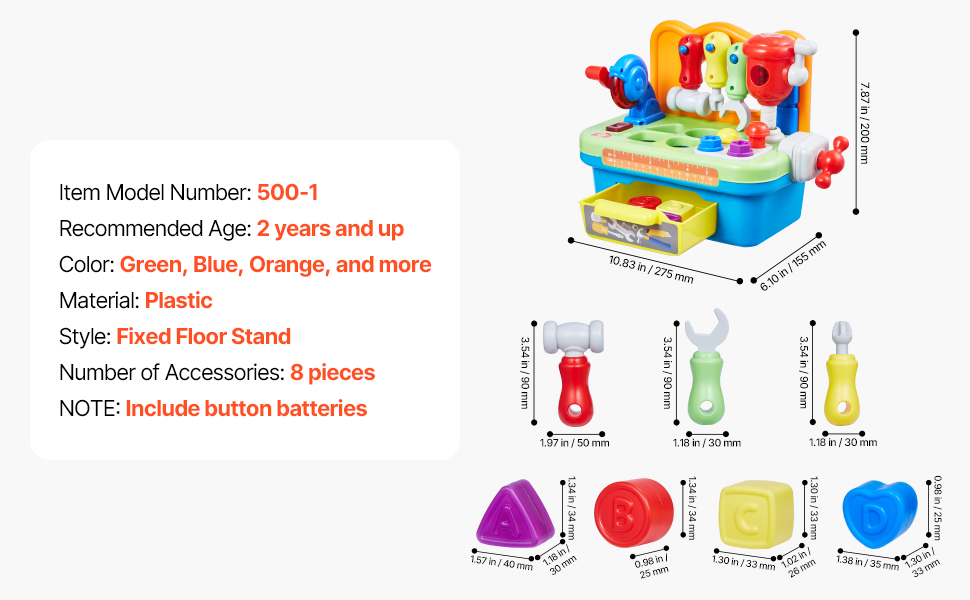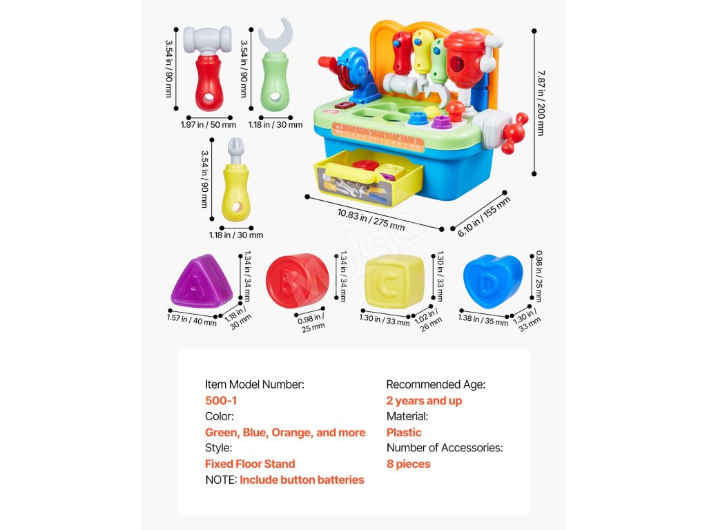 Hudobný vzdelávací pracovný stôl sa dodáva s 3 realistickými nástrojmi (skrutkovač, kľúč, kladivo) a 4 farebnými blokmi v zábavných tvaroch, ako sú štvorce, trojuholníky, srdiečka a kruhy. Ideálne pre malé rúčky na posilnenie úchopu pri bezpečnej hre.