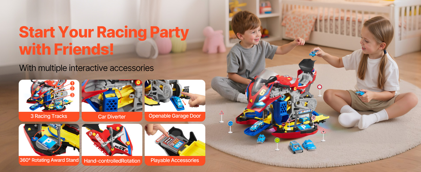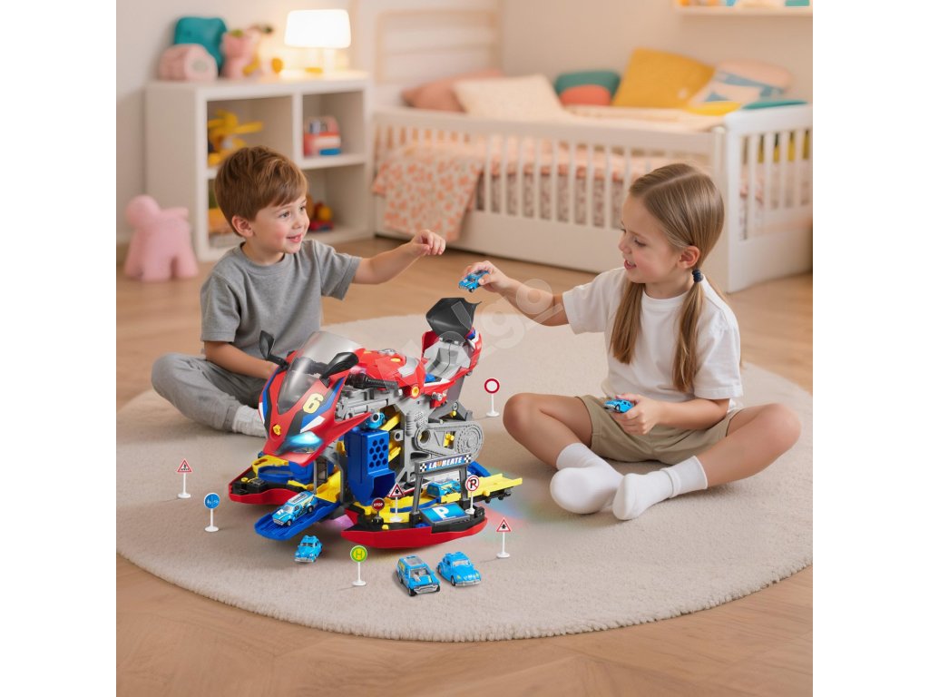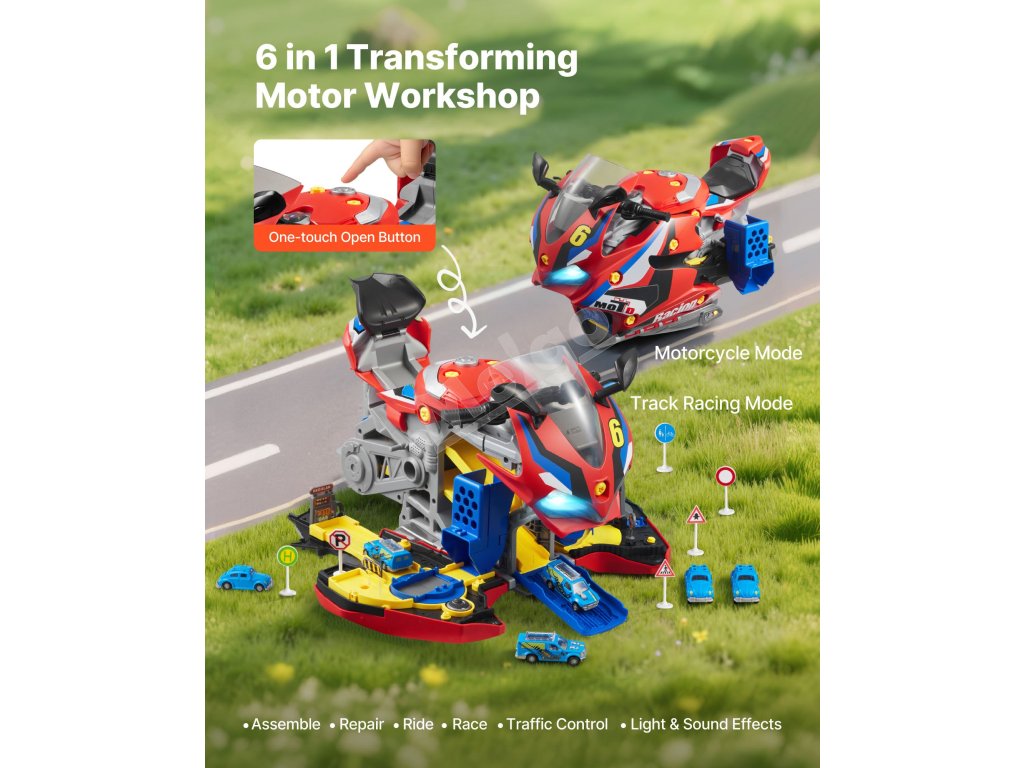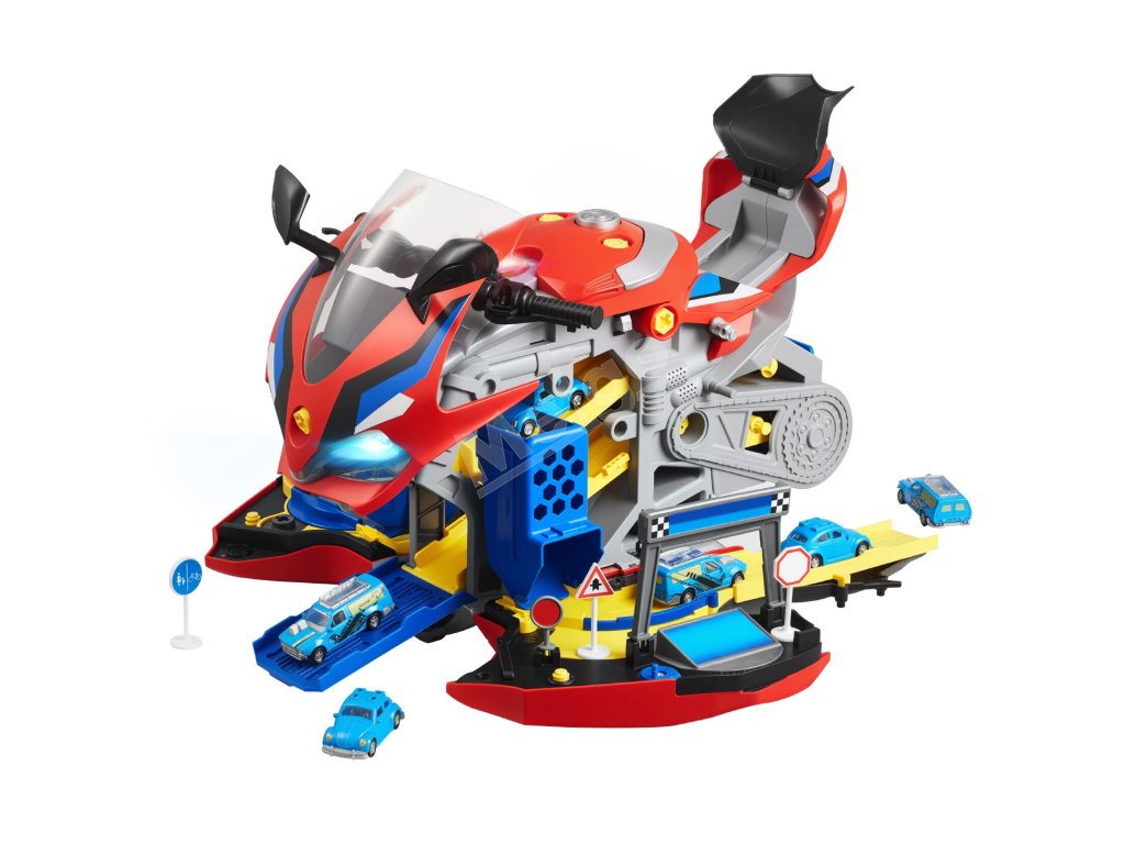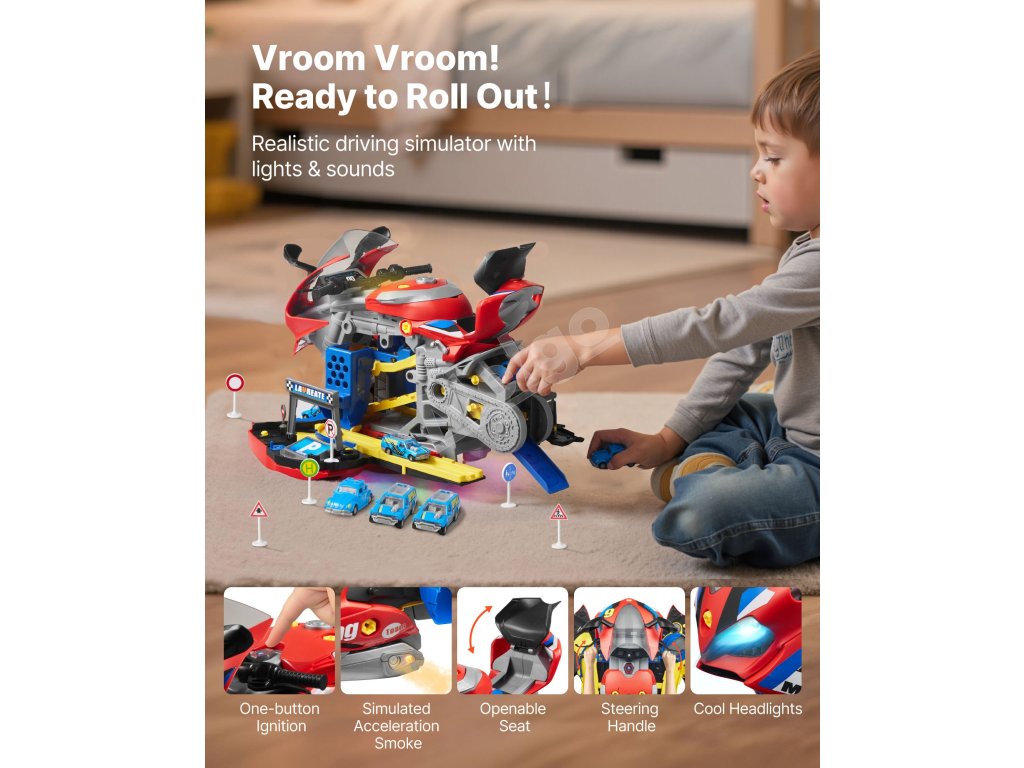 Otvorte karosériu motocykla a odkryte dve pretekárske dráhy. Deti môžu súťažiť s kamarátmi pomocou interaktívnych dielov, 6 miniatúrnych autíčok a 6 dopravných značiek. Nápaditá hra sa stretáva s priateľskými pretekárskymi výzvami v jednej hračke.