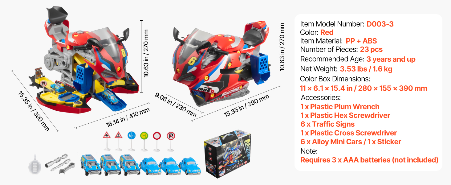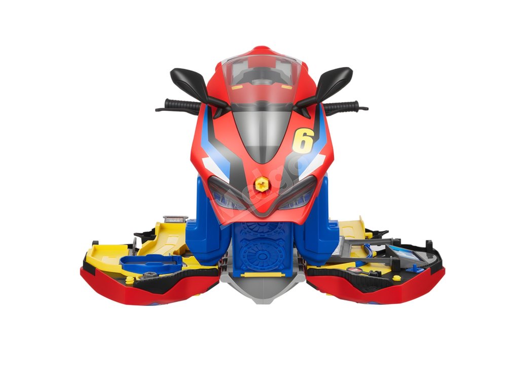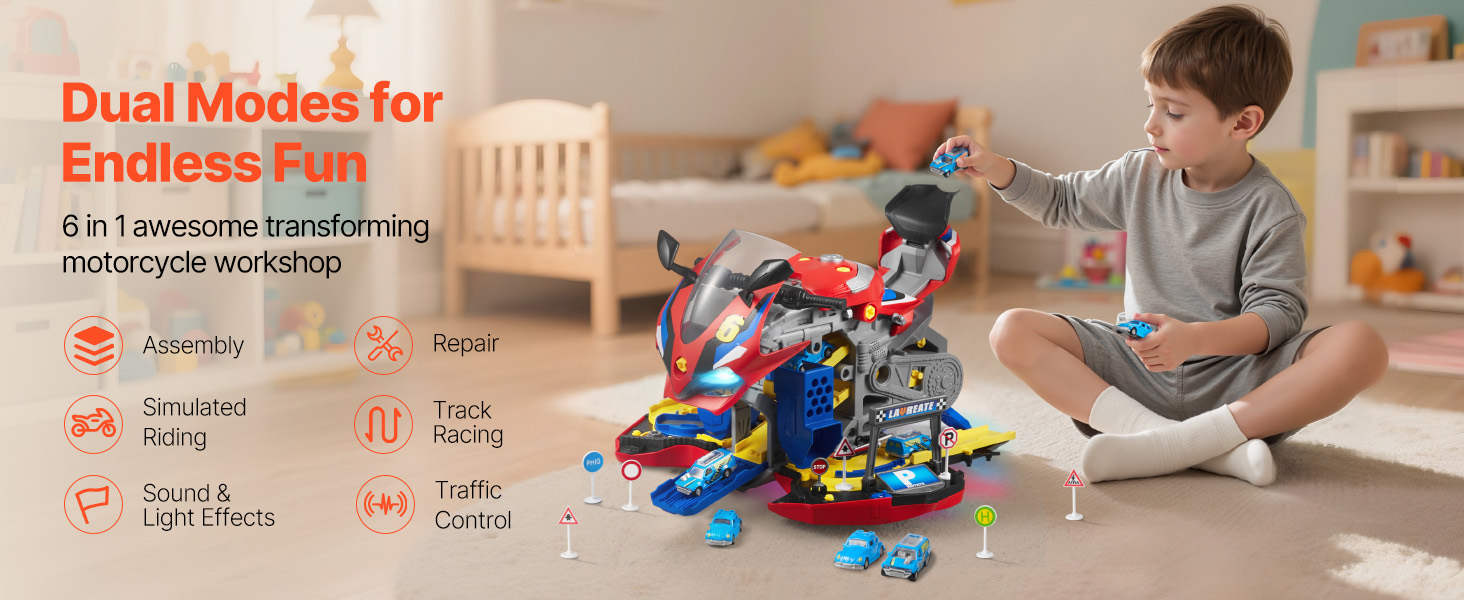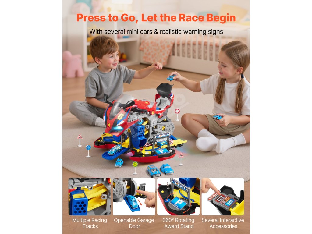 Otvorte karosériu motocykla a odkryte dve pretekárske dráhy. Deti môžu súťažiť s kamarátmi pomocou interaktívnych dielov, 6 miniatúrnych autíčok a 6 dopravných značiek. Nápaditá hra sa stretáva s priateľskými pretekárskymi výzvami v jednej hračke.