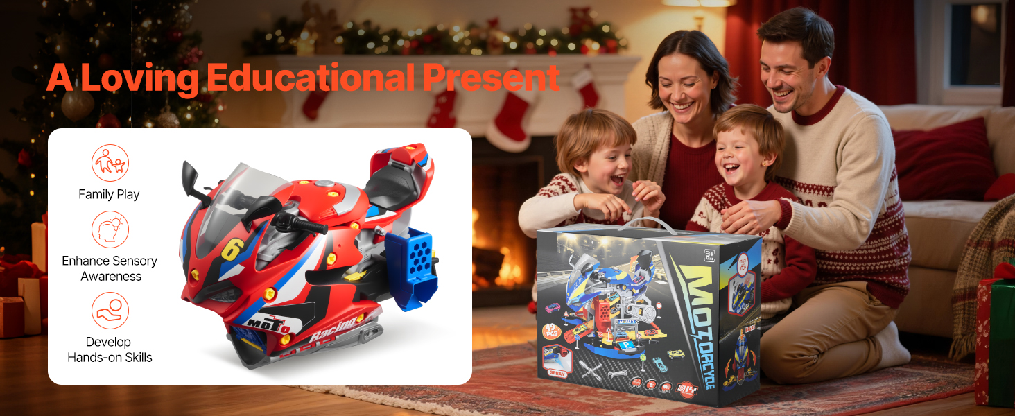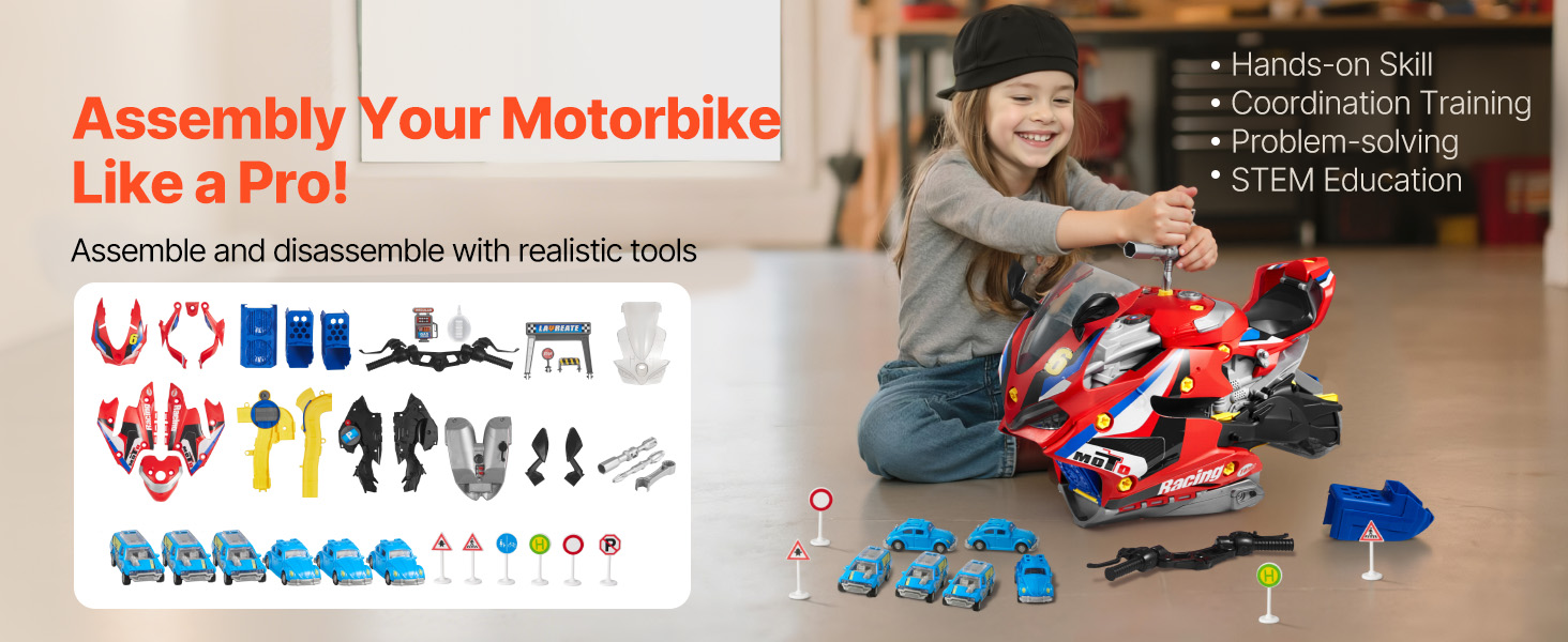 Nechajte deti preskúmať, ako funguje motorka! Celá hračka motora sa dá rozobrať a opäť zložiť, pričom realistické nástroje napodobňujú dielňu. Je to zábavná STEM hračka, ktorá zavádza riešenie problémov a mechanické myslenie.