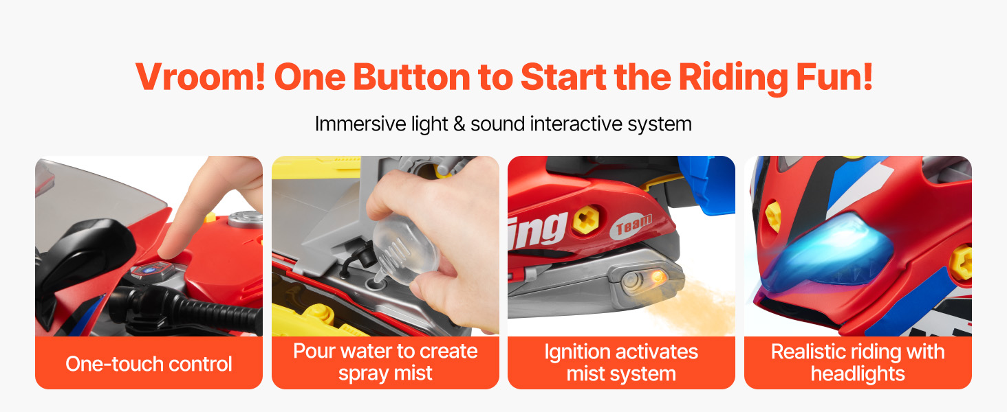 Táto hračka na opravu motora obsahuje nálepky na kreatívne zdobenie. Stlačte tlačidlo štartovania, aby ste počuli realistické zvuky motora, pridajte vodu na simuláciu výfukovej hmly a sledujte blikanie svetiel pre vzrušujúci zážitok z jazdy.
