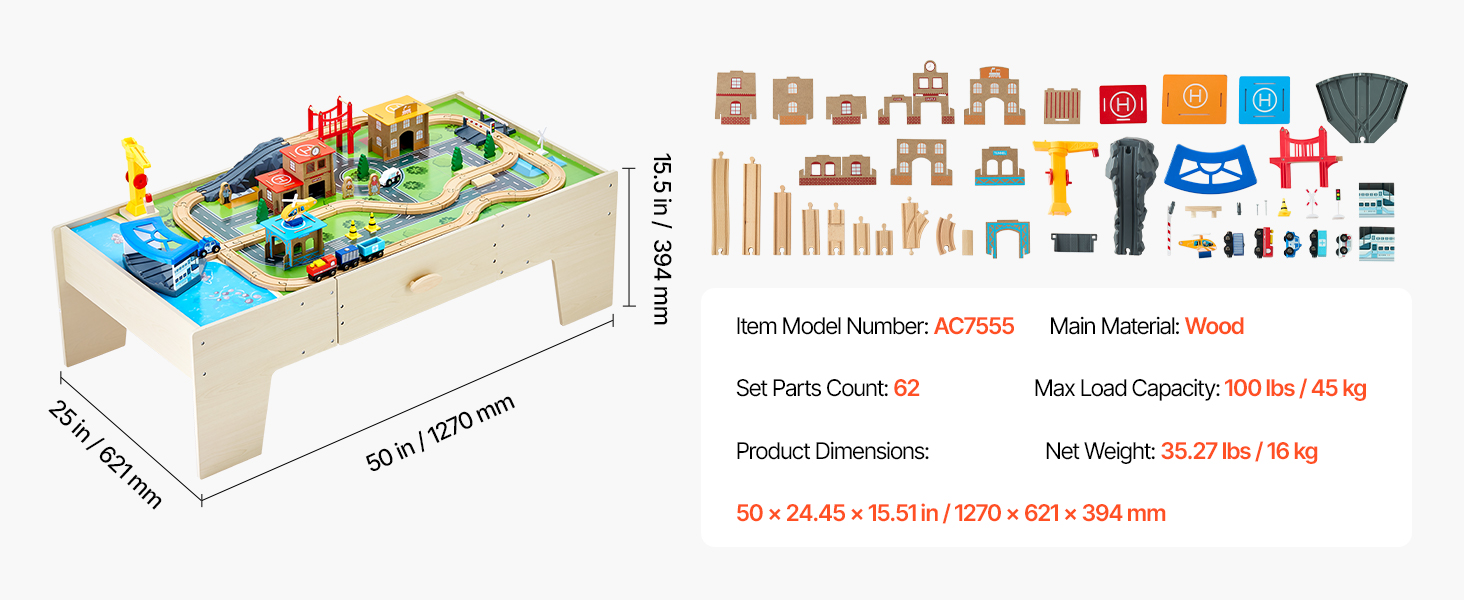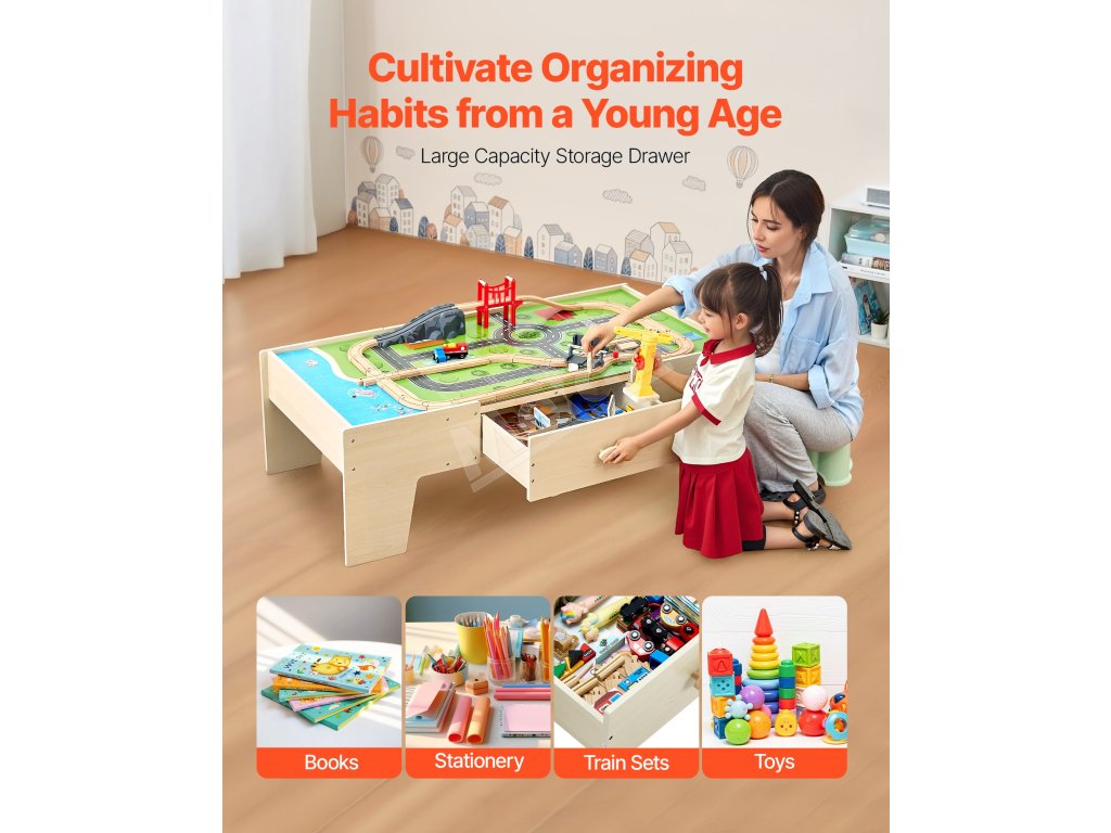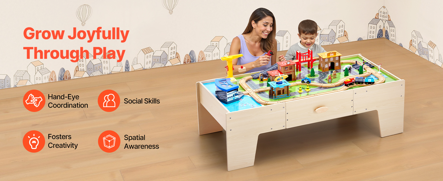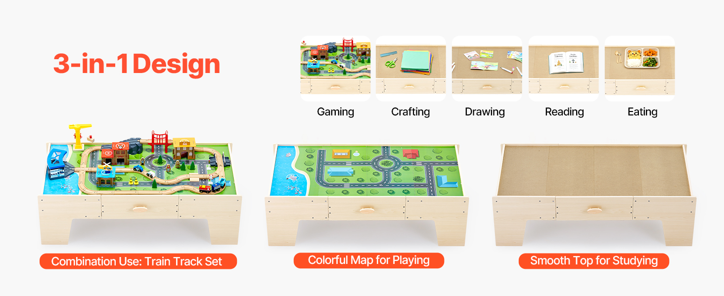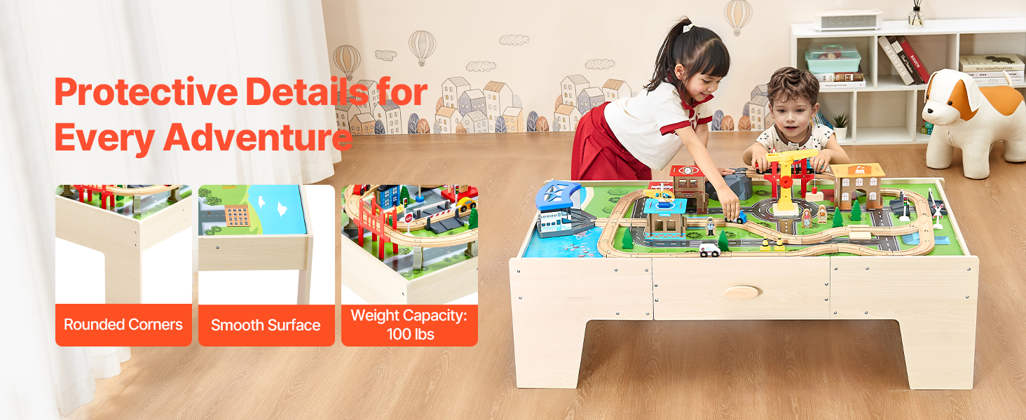 Vláčikový stôl má zaoblené rohy, aby sa zabránilo nárazom, hladký povrch bez otrepov, aby sa zabránilo poškriabaniu, a nosnosť 100 libier, ktorý je skonštruovaný tak, aby vydržal detskú hru pre pokoj rodičov.