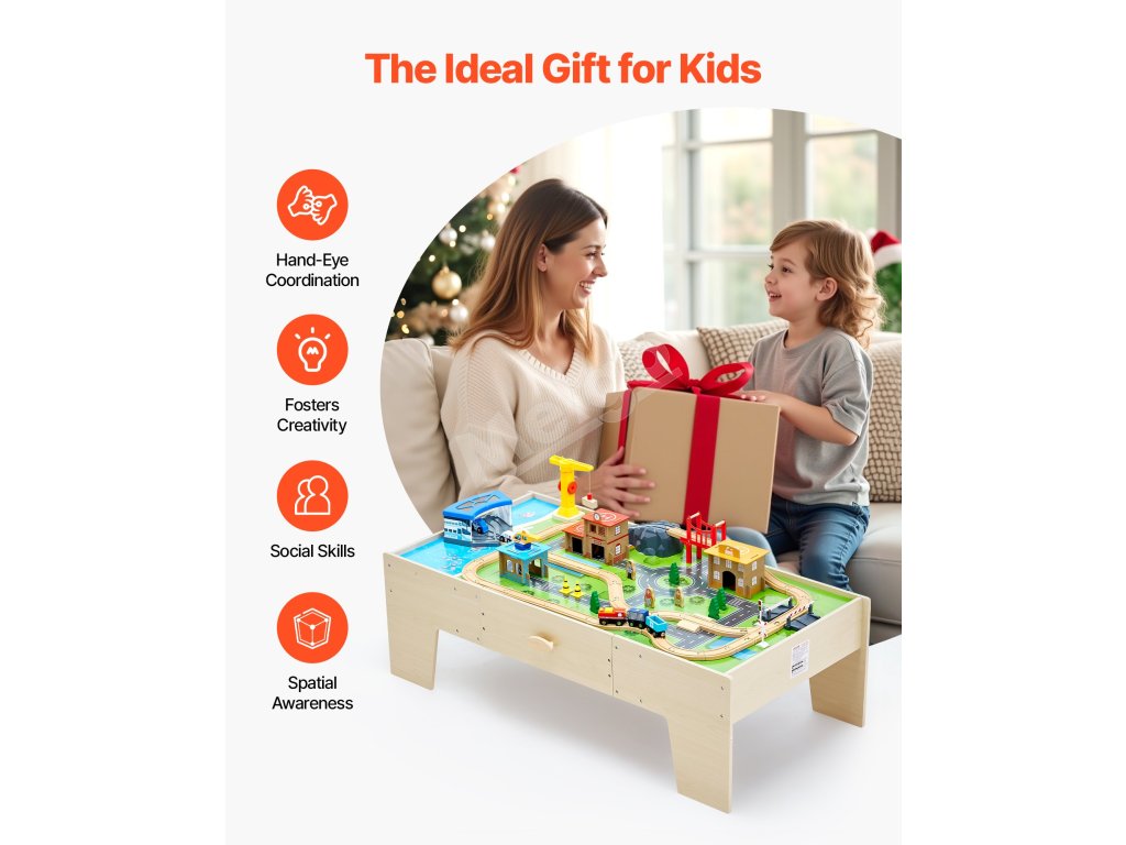 Tento drevený stôl na aktivity pre deti je ideálnym darčekom na Vianoce, narodeniny a iné sviatky. Deti si pri hre môžu rozvíjať zručnosti, ako je koordinácia rúk a očí, priestorové plánovanie, sociálna interakcia, predstavivosť a organizácia.