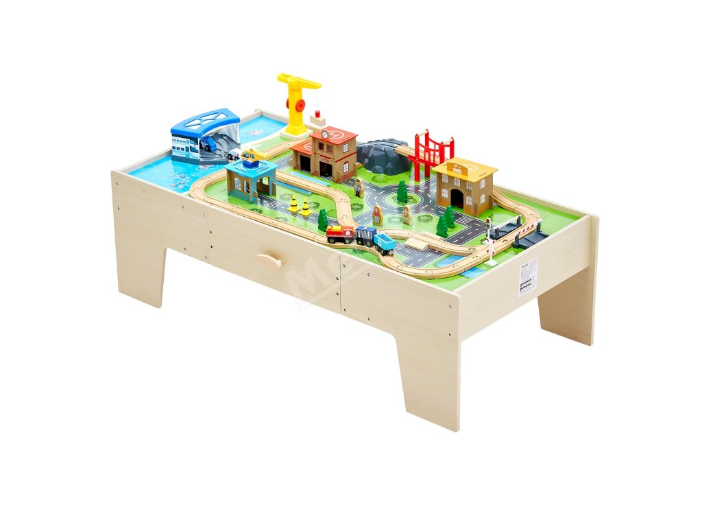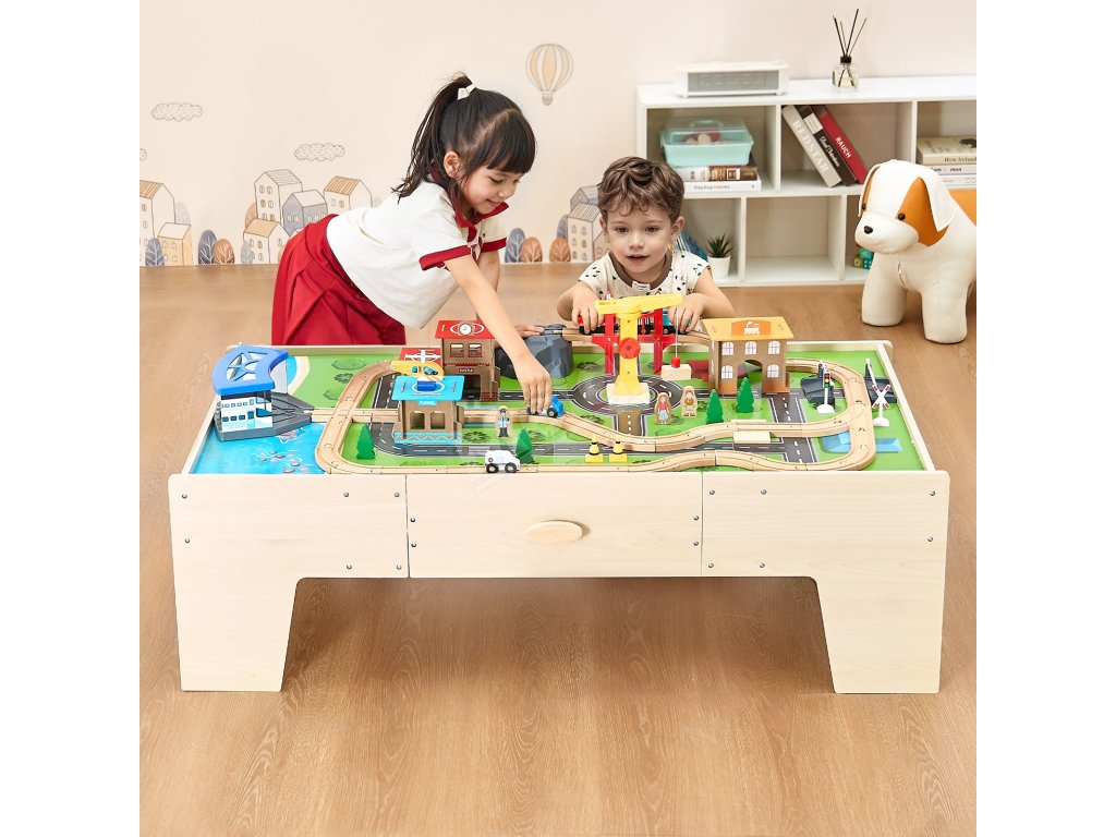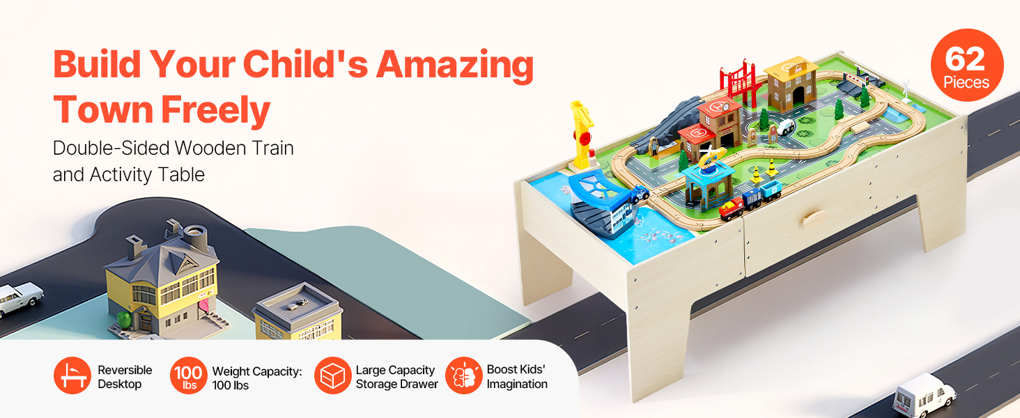 Tento 62-dielny stolík s vláčikom má obojstranný dizajn: farebnú mapu na hranie a hladký povrch na učenie. Vďaka robustnej drevenej konštrukcii unesie až 100 kg a obsahuje úložnú zásuvku pre jednoduchú organizáciu.