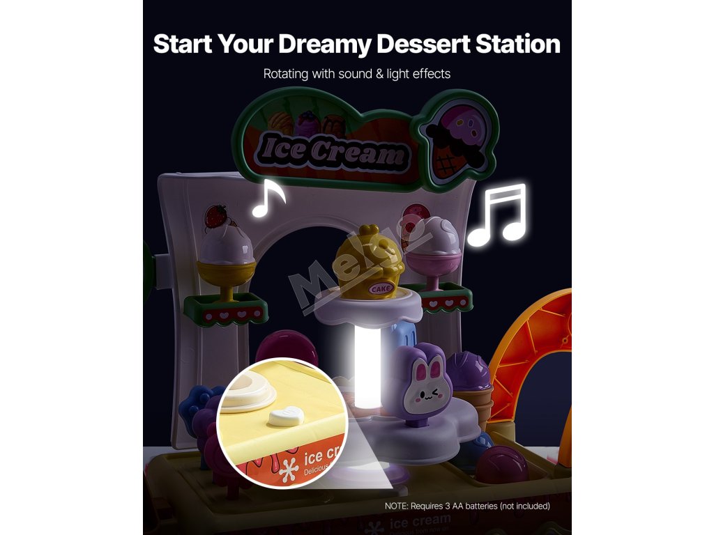 Viac ako len zmrzlinový vozík! Deti sa môžu hrať na predavača, vytvárať nové príchute alebo podávať dobroty. Vďaka otáčajúcemu sa, svietiacemu stojanu na zákusky s hudbou je každá hra mimoriadne zábavná!